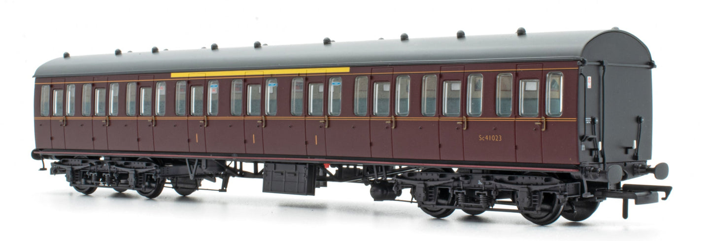 The change in appearance for the 57’ Mk.1 non-gangway stock was less marked, as the existing plain all-over Carmine Red weathered down to a shade not dissimilar to BR Maroon, but by 1959 the majority of the fleet was painted in the new livery. Regional preferences did still have an influence on the appearance of the stock, with the Eastern Region opting for a plain maroon livery, whereas Midland and Western Region stock appeared with the same lining as the gangway stock, The Scottish Region, which served both Eastern and Midland Regions, had a mixture of plain and unlined stock.
