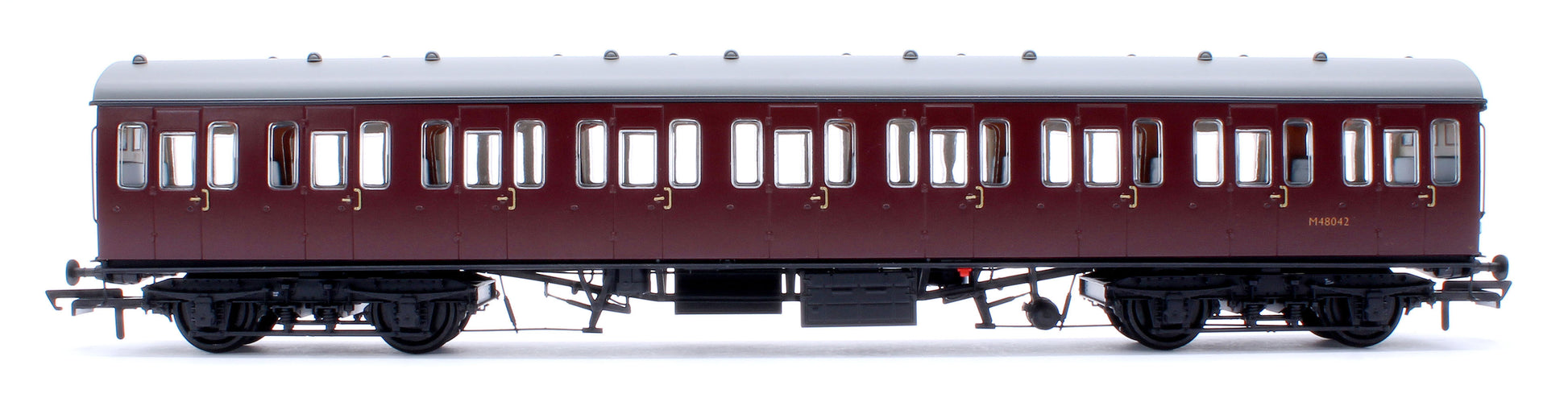 The change in appearance for the 57’ Mk.1 non-gangway stock was less marked, as the existing plain all-over Carmine Red weathered down to a shade not dissimilar to BR Maroon, but by 1959 the majority of the fleet was painted in the new livery. Regional preferences did still have an influence on the appearance of the stock, with the Eastern Region opting for a plain maroon livery, whereas Midland and Western Region stock appeared with the same lining as the gangway stock, The Scottish Region, which served both Eastern and Midland Regions, had a mixture of plain and unlined stock.