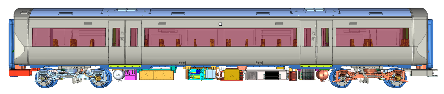 - Low mounted, high quality 5-pole skew-wound motor, with single flywheel, driving the lead bogie of the DMCO only. This means that each 4-car unit is powered from the front and rear cars.