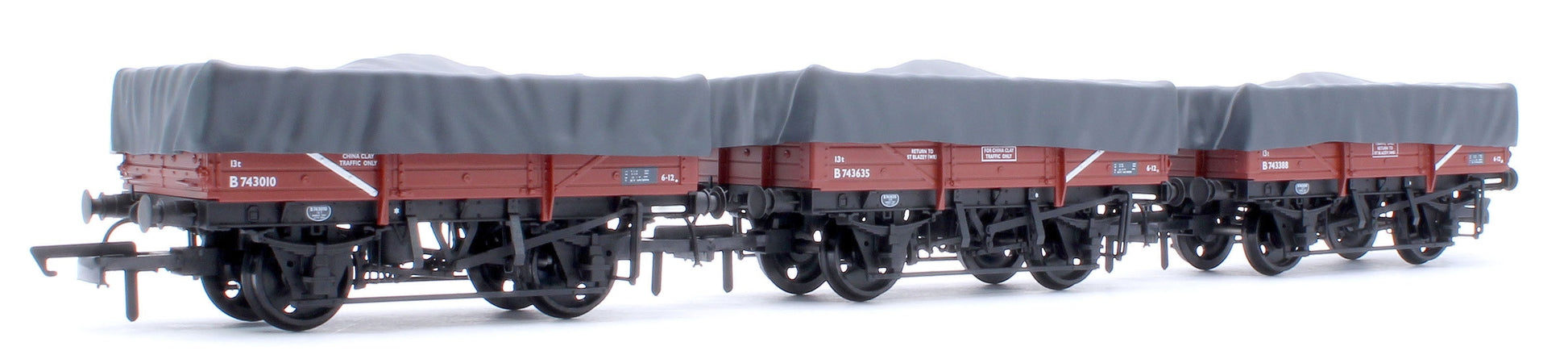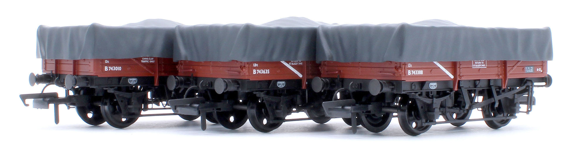 The sheets/hoods on the new clayhood wagons are removable showing a fully detailed interior and tarpaulin bar (if fitted) with correctly oriented longitudinal floor planks. The wagons feature a diecast underframe and axles running in brass bearings for super smooth running.
