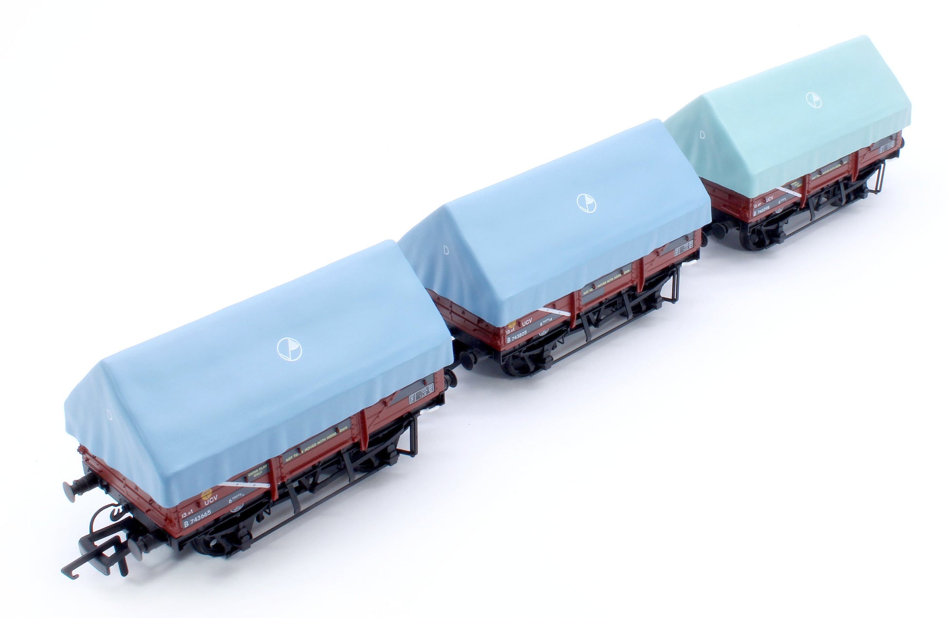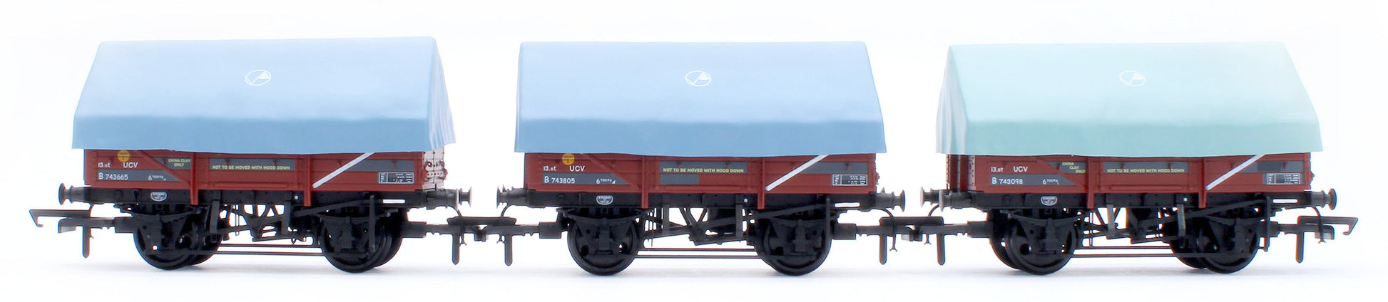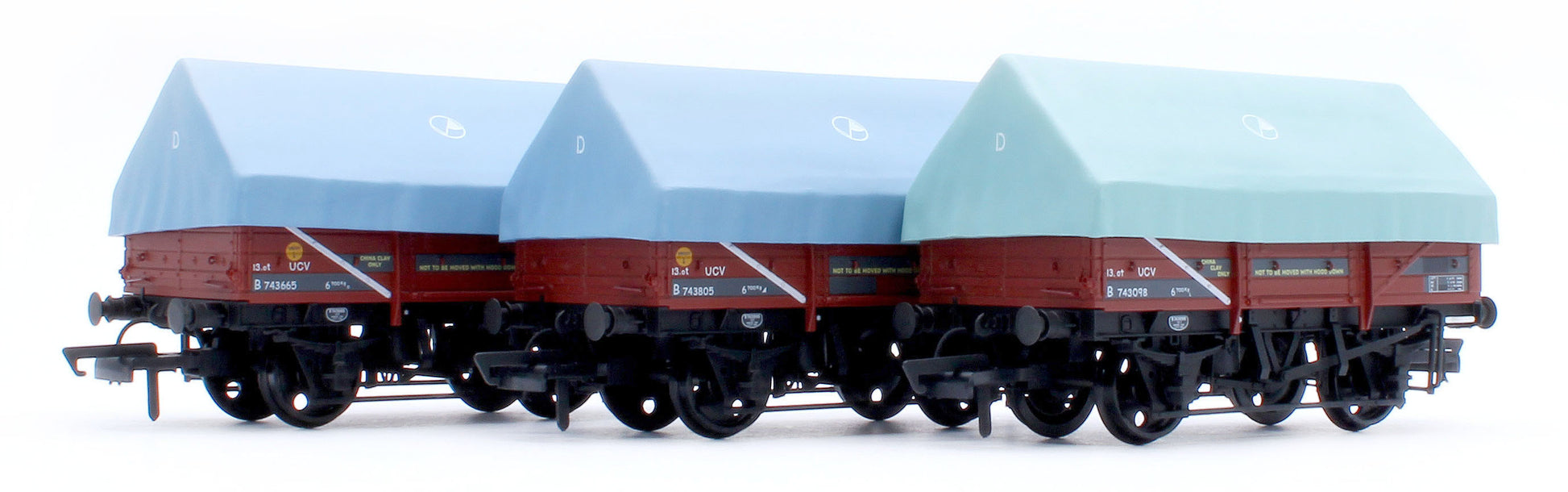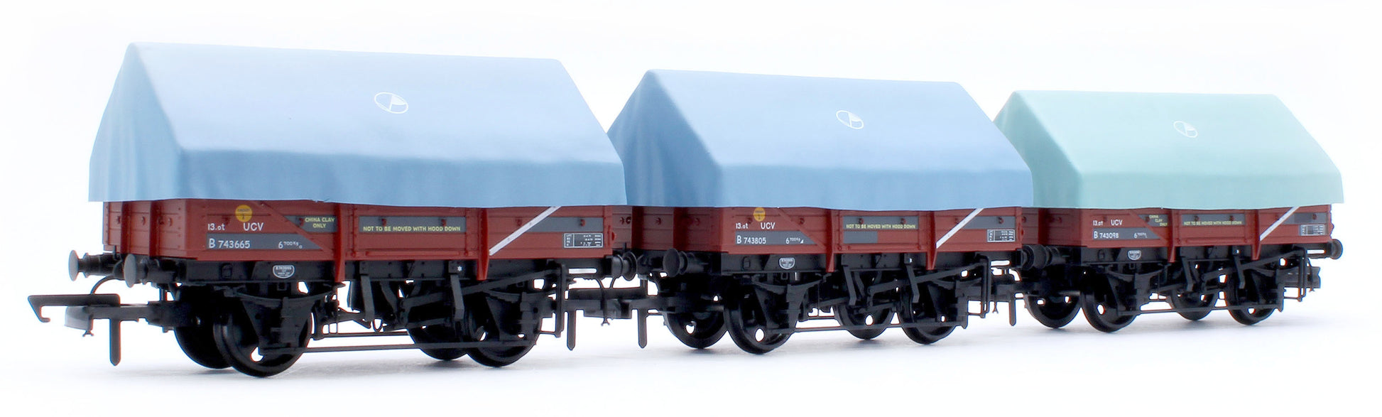The sheets/hoods on the new clayhood wagons are removable showing a fully detailed interior and tarpaulin bar (if fitted) with correctly oriented longitudinal floor planks. The wagons feature a diecast underframe and axles running in brass bearings for super smooth running.