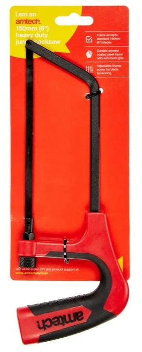 DURABLE: This dual colour junior hacksaw has a durable, powder coated steel frame with soft touch grip and an adjustable thumb screw for blade tensioning. ACCEPTS ALL BLADES: Compatible with Amtech's 150mm (6") hacksaw blades (M1300) it also accepts all standard 150mm (6") blades.