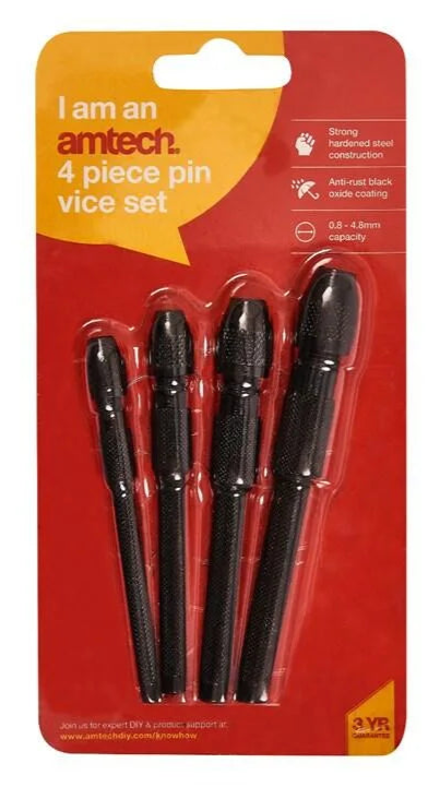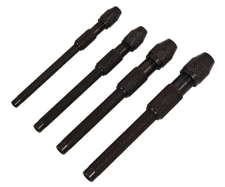 DURABLE: This 4 piece pin vice set is made from strong hardened steel with an anti-rust black oxide coating for durability. SIZES: The set includes sizes: 0mm - 0.8mm, 0.8mm - 1.3mm, 1.3mm - 3.1mm and 3.1mm - 4.8mm.