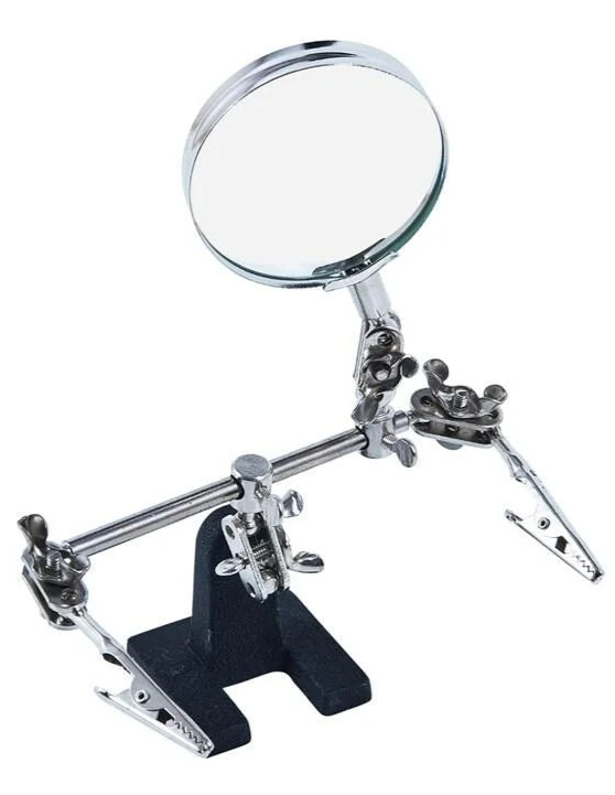 2X MAGNIFICATION: This helping hand magnifying glass has a 60mm diameter lens, giving x2 magnification. VERSATILE: With moveable arms and crocodile holding clips, allowing hands-free use, it is ideal for hobbyists and model making.