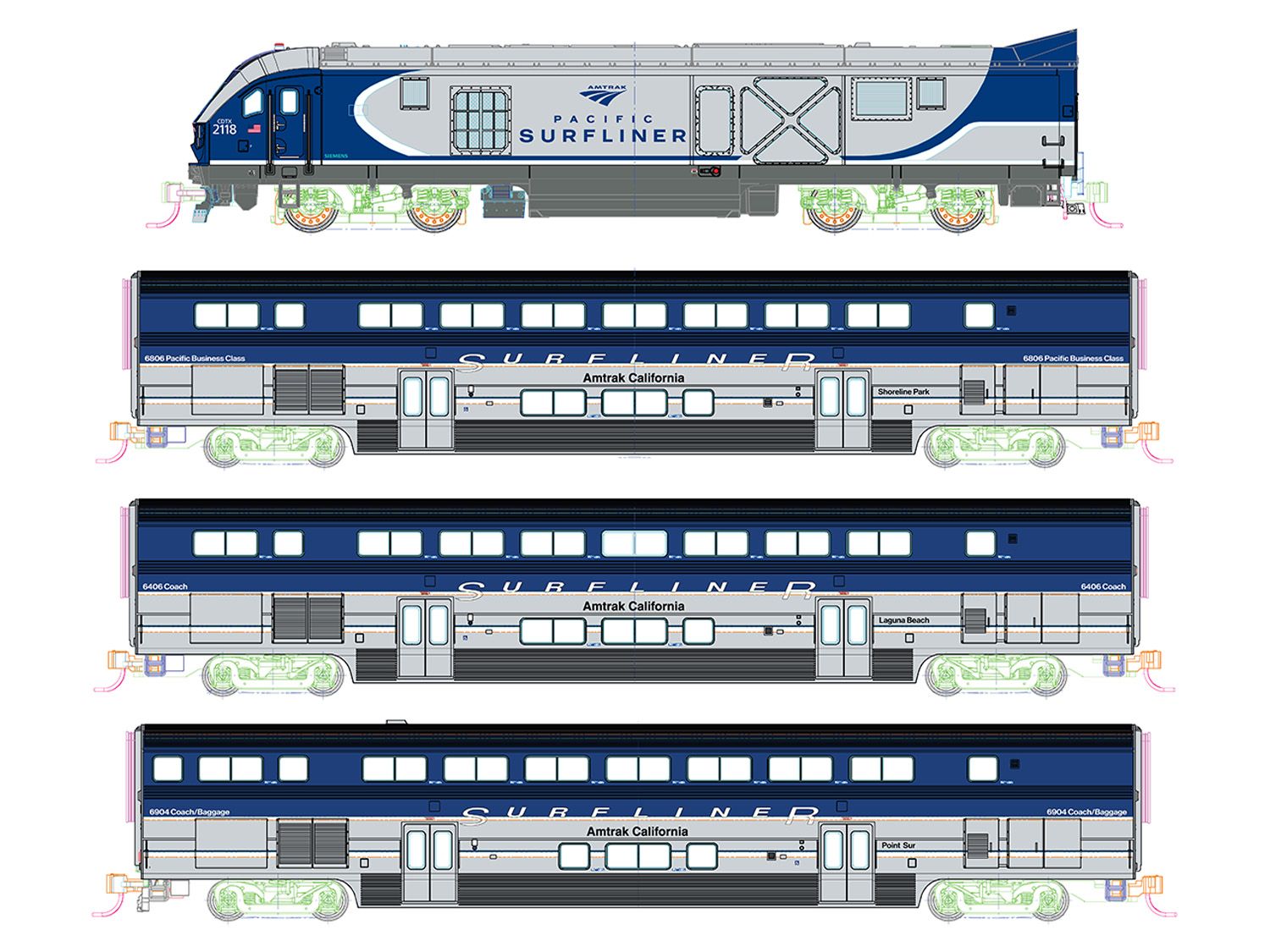 The trainsets used for regular service are composed from a fleet of 52 Bi-Level Surfliner coaches, and 9 Amtrak Superliners modified for push-pull Operation. First introduced in 2000 the Surfliner coaches were designed specifically to handle the demand for the rail corridor by including 2 sets of doors on each coach. The Pacific Surfliner runs with a dedicated fleet of SC-44 Siemens Charger locomotives with a unique cowl to streamline the locomotives and coaches. Unique to the Pacific Surfliner is a special blue and silver livery resembling its namesake of the Pacific Ocean.