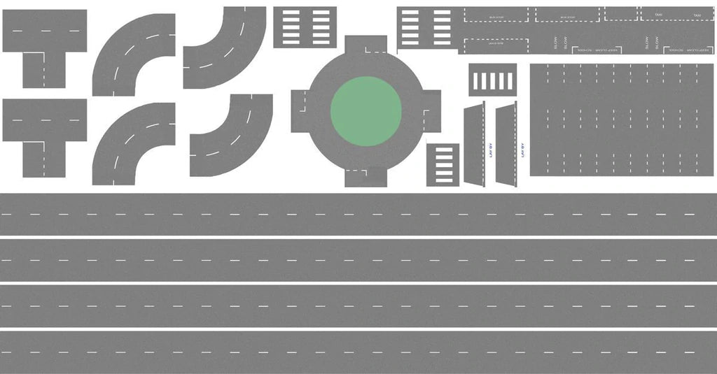 This pack contains: 4 x 1.5 meter lengths of road with centre marking, 1 x roundabout, 4 x 90 degree corners, 1 x car park, 3 x bus stops, 2 x laybyes, 1 x parking space, 2 x T-Junctions, 6 x pedestrian crossings, 4 x slow markings, 1 x taxi rank, 2 x keep clear school markings