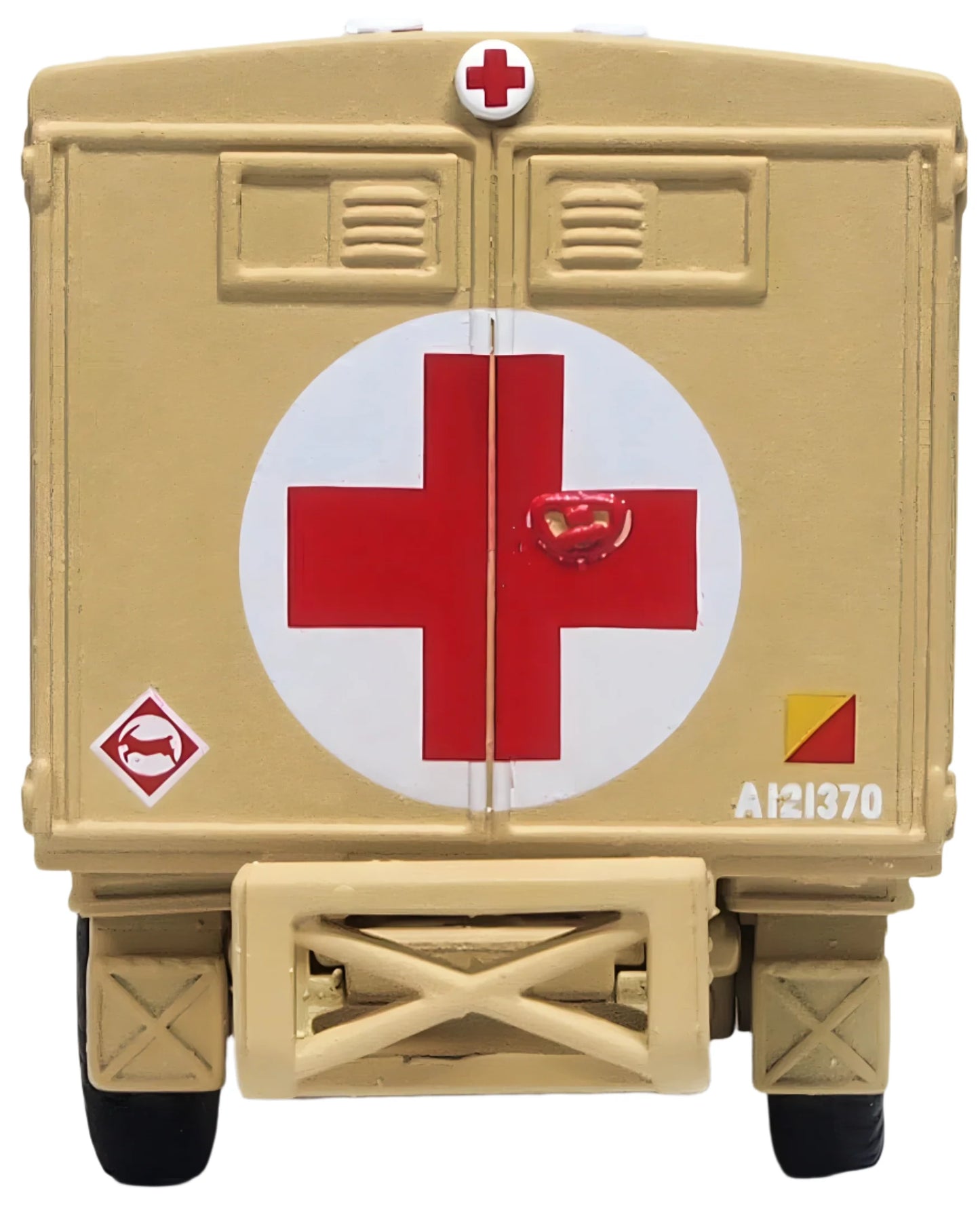 The Austin K2/Y Ambulance, affectionately known as KATY, was built between 1939 and 1945 by Austin at their Longbridge plant in conjunction with Mann Egerton - well-known for their bus body manufacturing expertise. It was quite a large vehicle, 18ft in length, 7ft 5 inches wide and just over 9 feet high. To save as much space as possible for the wounded, the crew was limited to 2-3 personnel. Weighing just over 3 tons, the K2 came with a 6-cylinder 3462 Austin D-Series engine with four speed gearbox and had a top speed of around 50 mph. The vehicle featured two petrol tanks, one on each side holding 12 gallons of fuel each. Just over 13,000 K2 Ambulances were built and proved very popular with British and Commonwealth troops as well as US forces. Two large doors across the back opened up to enable the K2 to accommodate ten casualties sitting or four stretchers. The rear body had been designed specially by the Royal Army Medical Corps and built by Mann Egerton. The driver’s cab did not have doors but folding canvas sheets instead. Similar access also meant that the patients could be reached from the driver’s cab through a small internal door with a seat. The exterior of the vehicle comprised mostly painted canvas. A feature which helps date the variations of the K2 was the shape of the roof vents. Early ones were round and later ones square. Our Oxford tooling is based on the early version with round roof ventilators.
