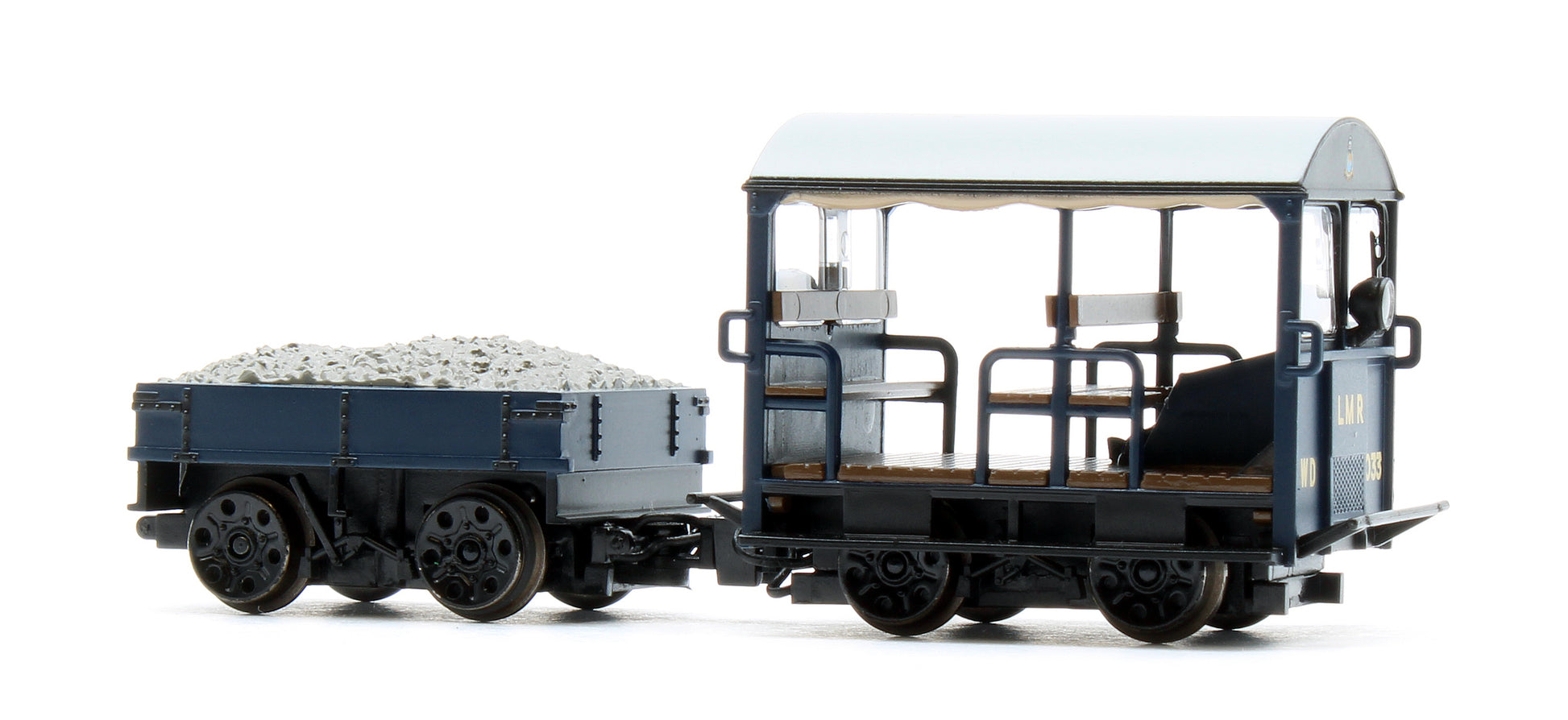 The Branchline model combines the trolley car, with its open cabin and seating for several personnel, with a trailer and it is here that the motor and mechanism is located, cleverly concealed by a ballast/spoil load. The trailer also sports a diecast metal chassis, with separate metal bearings fitted to the two axles and the gearing from the coreless motor to the driving axle is housed in a diecast metal gearbox. The driven wheelset is also fitted with traction tyres for assured running from this diminutive model. The semi-permanent coupling between the trolley and trailer allows electrical connections to be carried between the two, so that all eight wheels of the model can be equipped with pickups. With its wheels on full show, it’s easy to see that these have been replicated faithfully with the correct pattern and profile and brakes are added separately too. Meanwhile the trolley car itself has glazed windscreens with a separate windscreen wiper, headlights at the front and rear (non-functional), and a representation of the sheeting (that would have supposedly provided riders with protection from inclement weather!) rolled up and stowed along the roof edge.