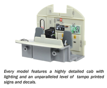 The bodyshell features crisp, accurate mouldings to depict the main features along with separately fitted parts, including etched bodyside and roof fan grilles, metal windscreen wipers and separately fitted driver’s door handrails. Inside the cab there is interior detailing which will be decorated appropriately whilst machine room detailing is visible through the bodyside grilles. The underframe equipment is all present and correct, composed of many separate parts along with sandboxes and sandpipes and sprung metal buffers, but it is the bogies that really bring this model to life. It’s hard to describe these as anything but a work of art, using countless separate components to model every aspect of the bogie in full relief, from the brakes to the suspension, even down to the separately fitted bogie-body securing chains.