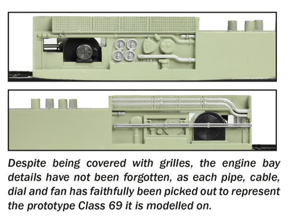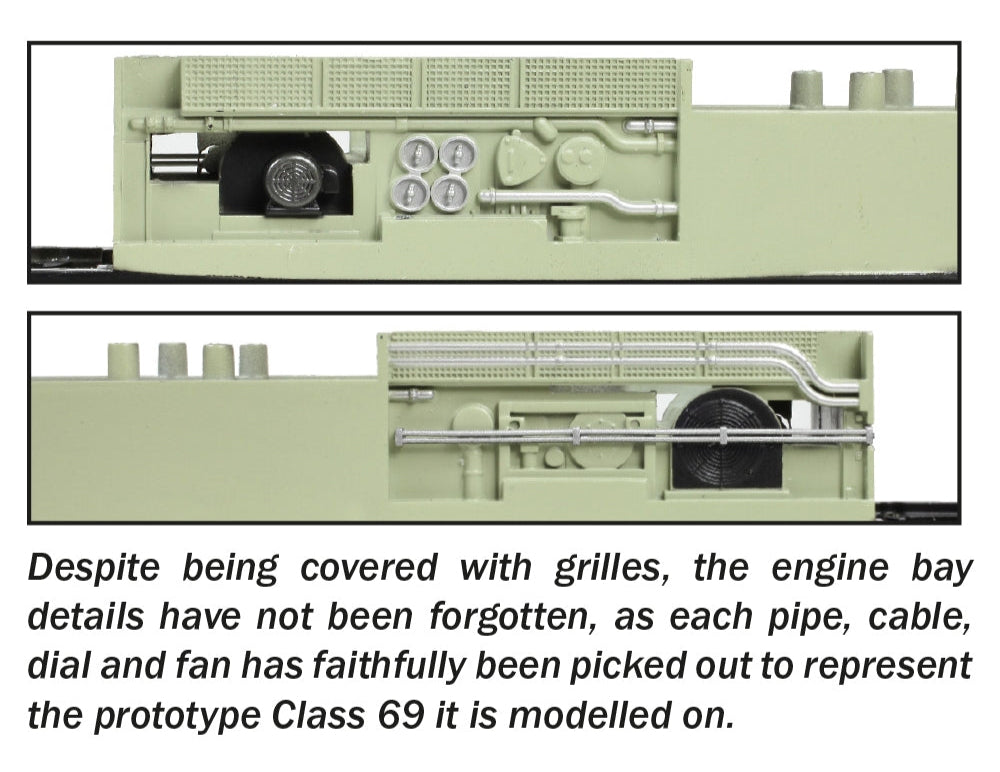 Under the body, the Branchline Class 69 features our proven drive system using a 5 pole motor with twin flywheels driving all axles on each bogie. Electrical pick-up comes from all wheels whilst DCC provision comes in the form of a Plux22 interface. Directional lighting is of course provided, along with cab and machine room lighting when used on DCC. The Dual Fitted speaker system is fitted to every model and this is fully utilised in our SOUND FITTED and SOUND FITTED DELUXE variants. Talking of SOUND FITTED DELUXE, opt for our top of the range model and you can enjoy the additional features of motorised radiator fans and DCC-uncoupling – thanks to the Bachmann Auto-release Coupling System!