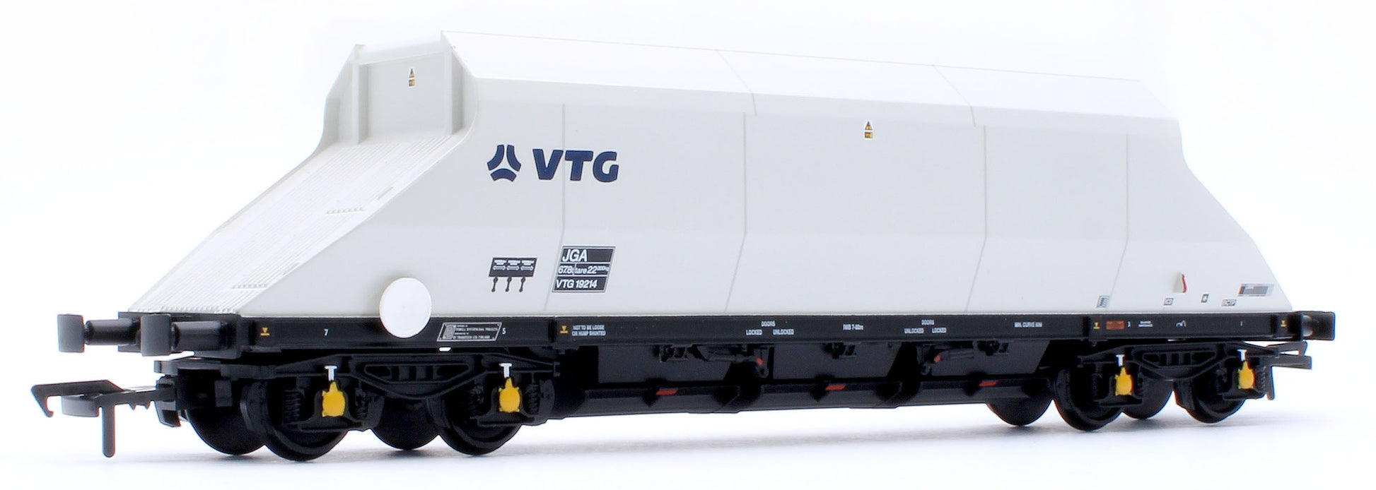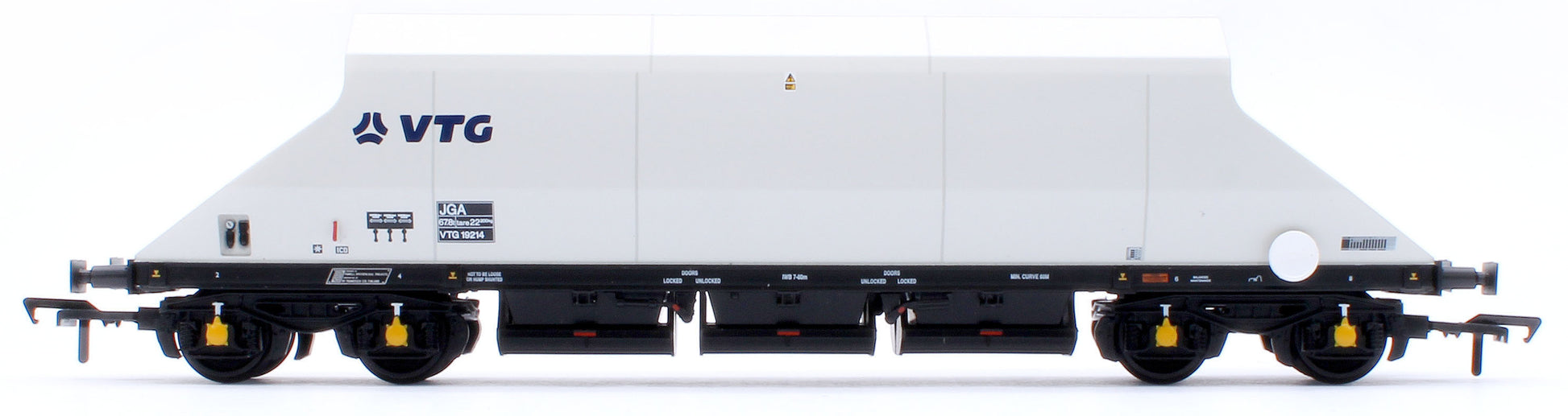 Reproduced in OO Scale by Bachmann Branchline, the JGA model features a precision moulded bodyshell which captures the wagon’s distinctive sloping ends with their ribbed constructed. Below the solebar, the three sets of discharge doors are added separately, meanwhile a metal weight is concealed above each bogie to ensure smooth running. The bogies themselves are fitted with metal wheels and axles whilst the integrated NEM coupling pockets allow alternative couplings to be fitted with ease. Separate brakes are added and the bogies each sport spring and suspension detailing in full relief. Whilst it could be said that the plain grey livery is the very definition of simplicity, the model’s paintwork is applied flawlessly complete with the VTG lettering and logo alongside the various markings and operating instructions that are found on the real wagons.