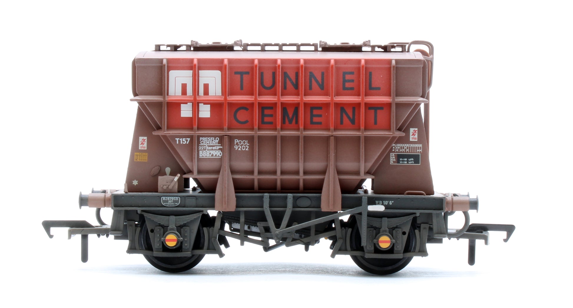 So, in 1954 the first ‘Presflo’ (short for pressure flow) was built, which utilised the science of air fluidisation, a process which pumps air into the powder to prevent clumping and keep it loose, allowing the powder to be drained from the wagon efficiently. The design was very successful and lasted well into the 1980’s, finding use on different traffic flows up and down the country. This particular model depicts a ‘Presflo’ in BR Bauxite livery with ‘Tunnel Cement’ branding and a weathered finish.