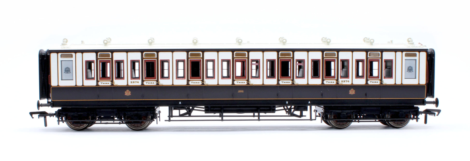 Between the bogies, the underframe detailing includes finely detailed truss rods along with brake components which can be configured to depict coaches fitted with either Westinghouse or vacuum brakes. Large gas cylinders are fitted to gas-lit vehicles, and these are substituted for battery boxes on coaches that were upgraded to electric lighting. Standard OO scale tension lock couplings are fitted at either end, attached via NEM coupling pockets to the chassis-mounted close coupling mechanisms. The detailing continues inside the model, with seating and compartment partitions replicated, including compartment doors with hinge and handle detailing – even the toilet and hand basin are reproduced in the toilet compartments.