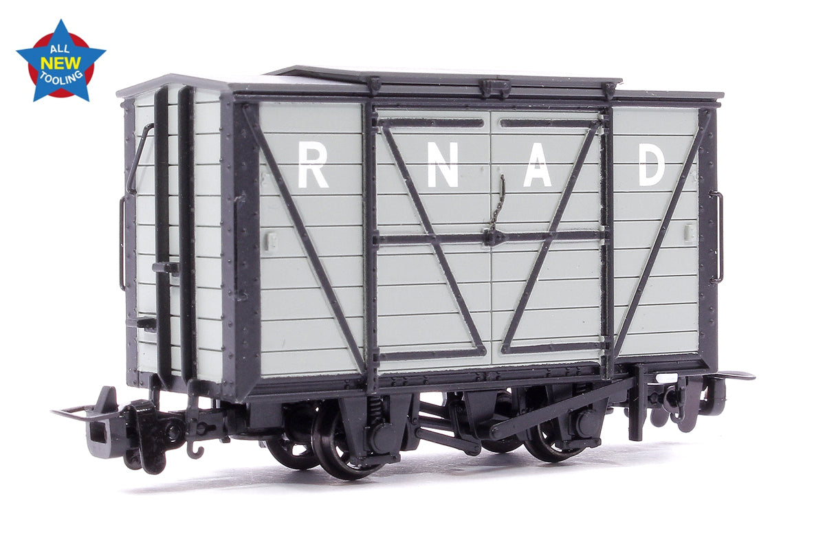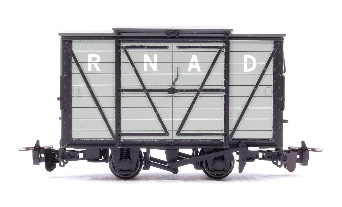 Royal Navy Armaments Depots (RNAD) were strategic sites located around the UK for the storage and supply of armaments to the Royal Navy and other British and Commonwealth Armed Forces. Usually comprising several underground ‘magazines’, they were usually rail served by the national network and many had internal narrow gauge railway systems in order to aid movements between the standard gauge facility, magazines and workshops. The railways were equipped with their own fleets of locomotives and rolling stock designed specifically for the task in hand. Although some of the railways operated as recently as the early-21st century, as closures occurred stock became redundant however a significant number of items have subsequently entered preservation gaining a new lease of life. This Van features roof hatches allowing large munitions to be loaded directly into the van from above via a crane and our model is finished in RNAD Grey, depicting a wagon in use at an RNAD site.
