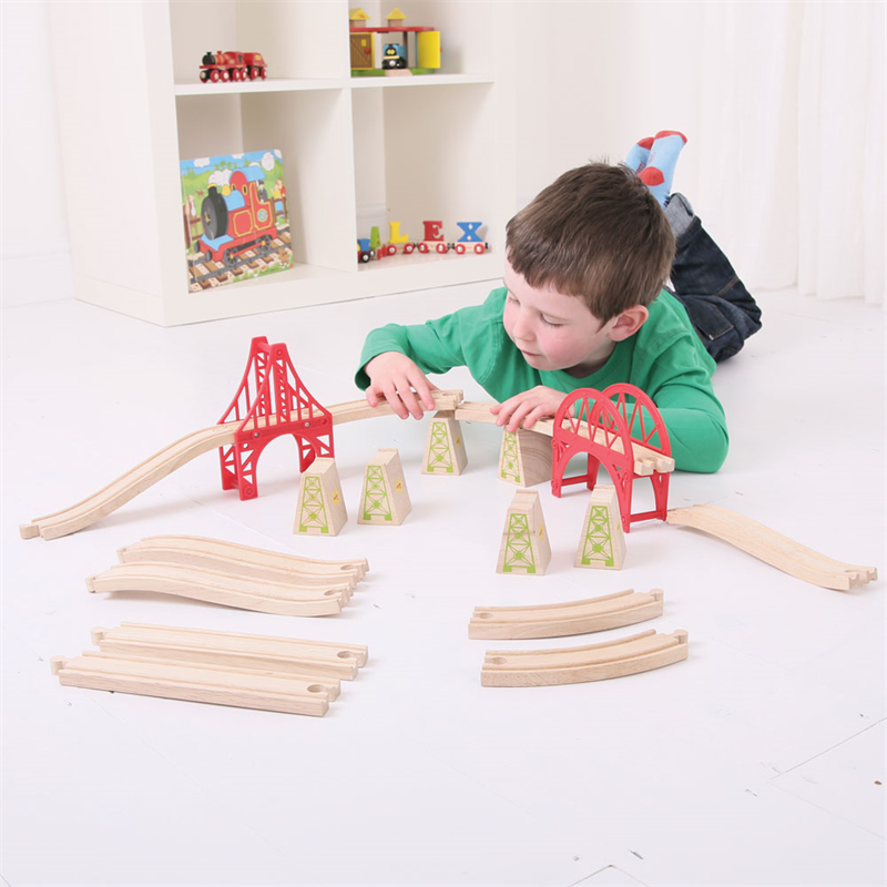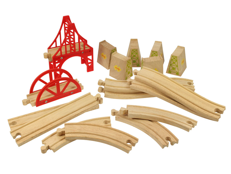 A quality wooden train accessory that features 18 play pieces including two red bridges, six high-level blocks, ascenders, descenders, curves and straights. Little rail enthusiasts can take their toy trains to new heights, lows, twists and more!