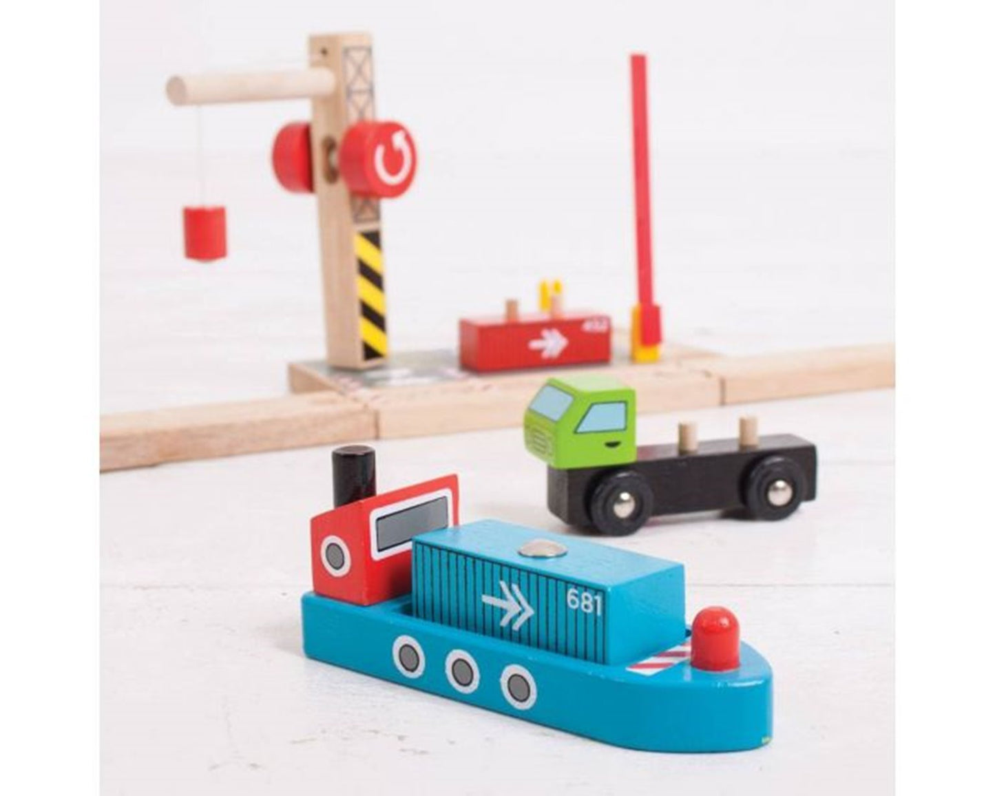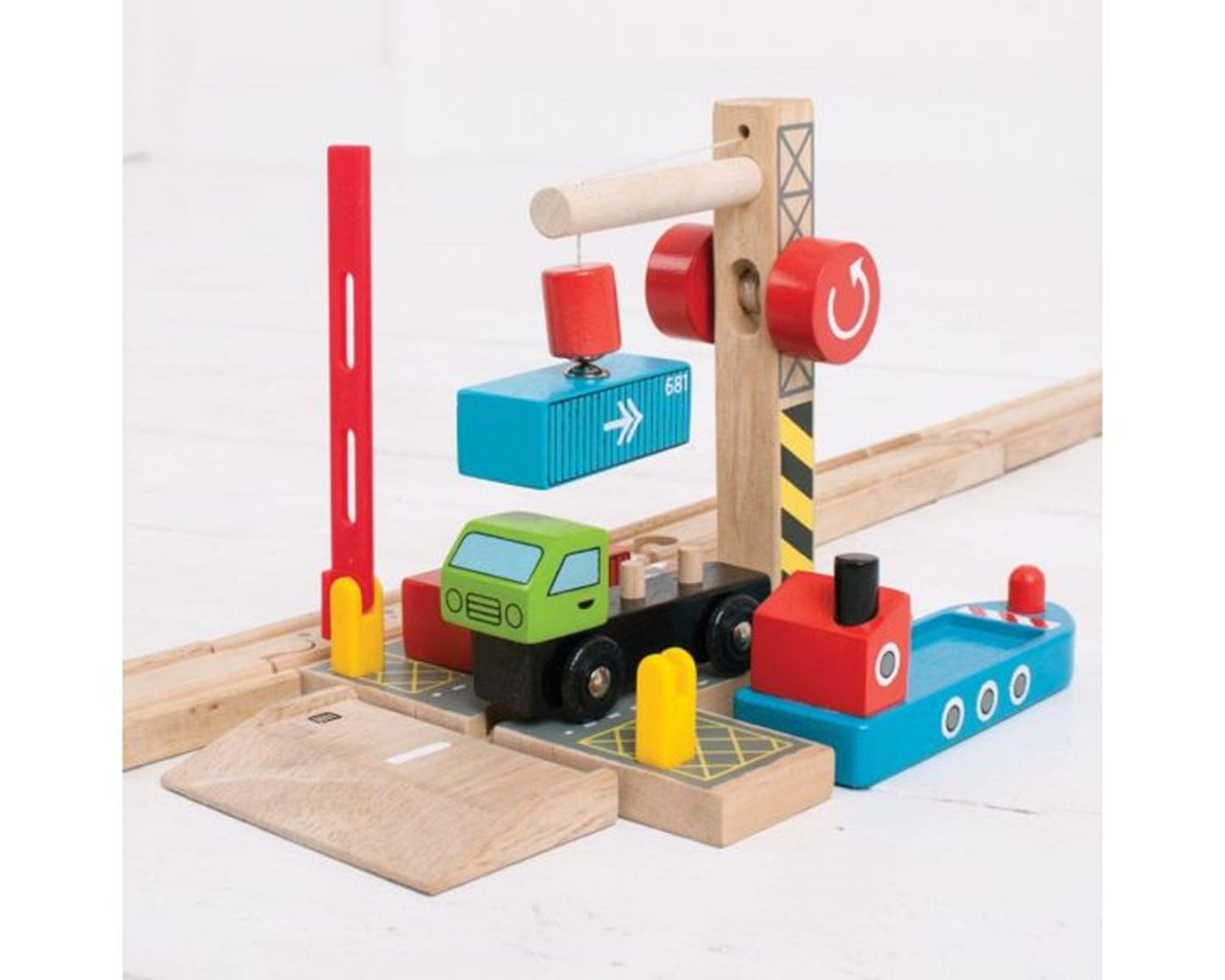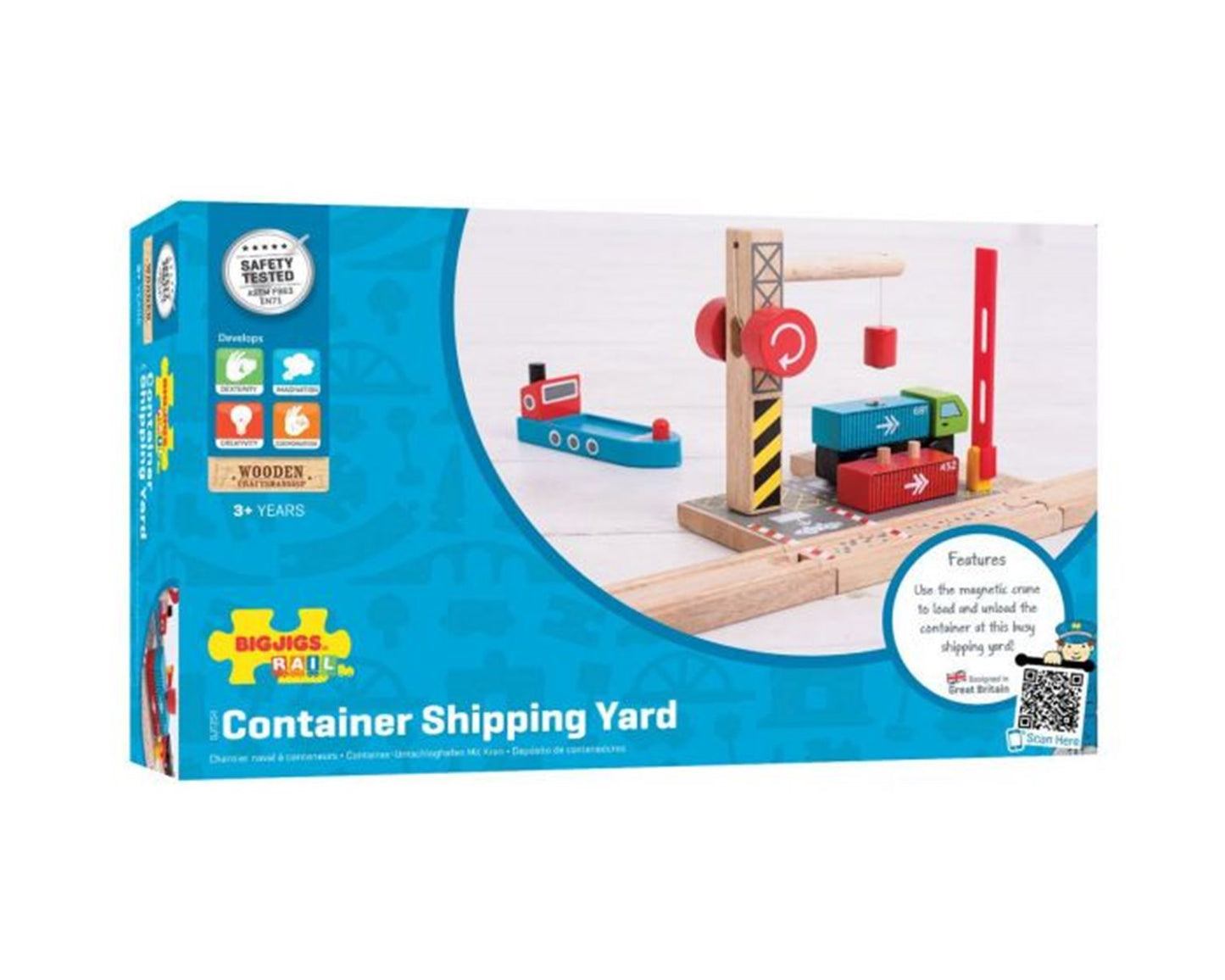 From ship to shore and back again! A working wooden crane is the focal point of this busy yard where a magnetic pulley can lift the shipping containers from ship to dock to lorry and back again, so the journey can continue by land, sea or rail. Open and close the barrier leading into the loading station to let the lorry drive in and out. Hours of interactive, fun role playing guaranteed. Encourages imagination, dexterity and co-ordination. Most other major wooden railway brands are compatible with Bigjigs Rail. Made from high quality, responsibly sourced materials. Conforms to current European safety standards.