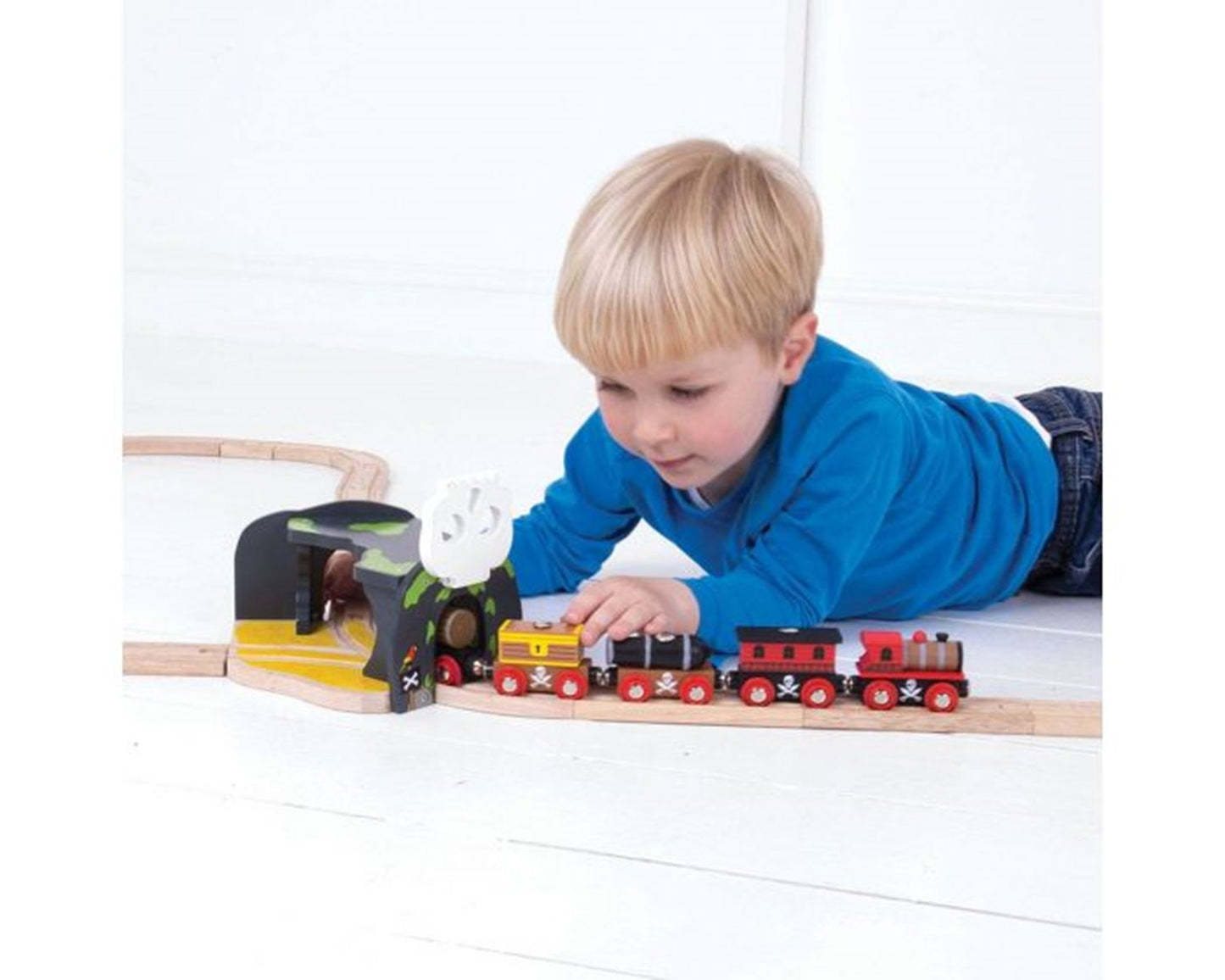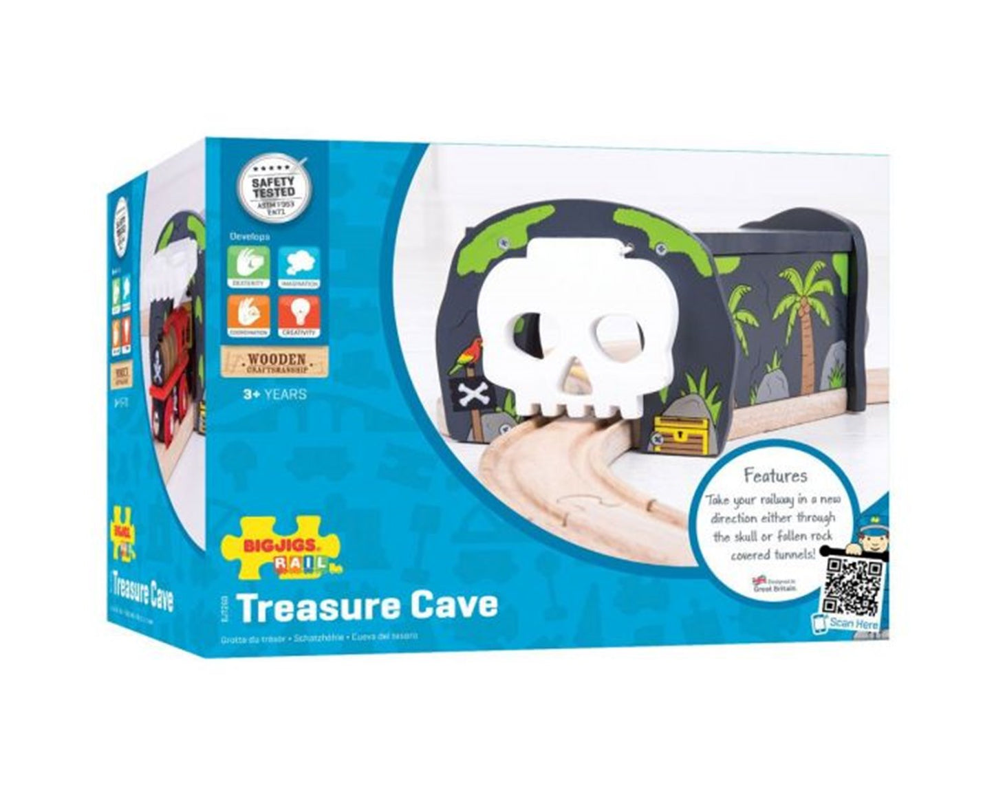 This wooden Skull Cave includes two pieces of track in the base to increase placement options within a track layout and create two tunnel entrances or exits. Lift the elasticated skulls on either end and guide your train through the skulls or journey through the fallen rock. Encourages imagination, dexterity and co-ordination. Most other major wooden railway brands are compatible with Bigjigs Rail. Made from high quality, responsibly sourced materials. Conforms to current European safety standards.