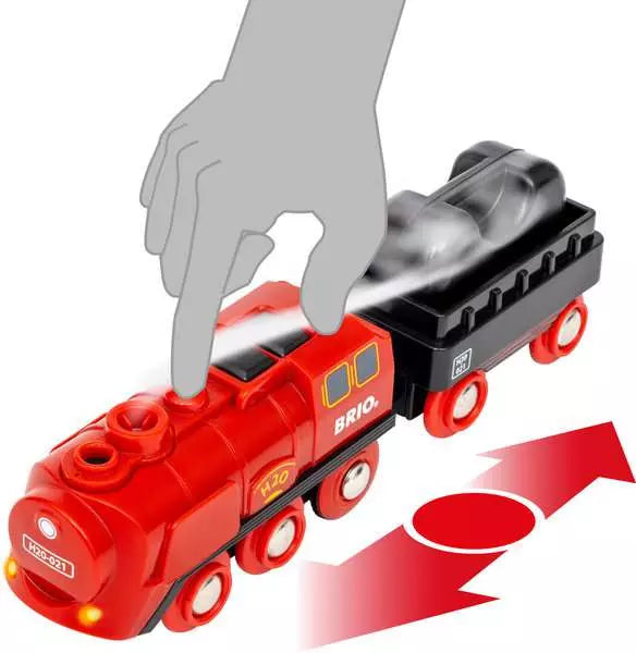 Chug around this classic figure 8 train set with realistic steam effects in the 36017 Steaming Train Set. The red battery-powered engine produces safe-to-touch steam as it drives around the tracks. Once you’re out of water, simply refill the engine using the refill load that’s pulled behind the train. Press the red forward button on the top of the engine, the front lights turn on as the steam starts to rise and you’re off again on more classic wooden railway adventures.