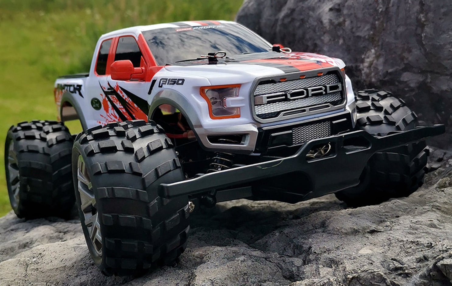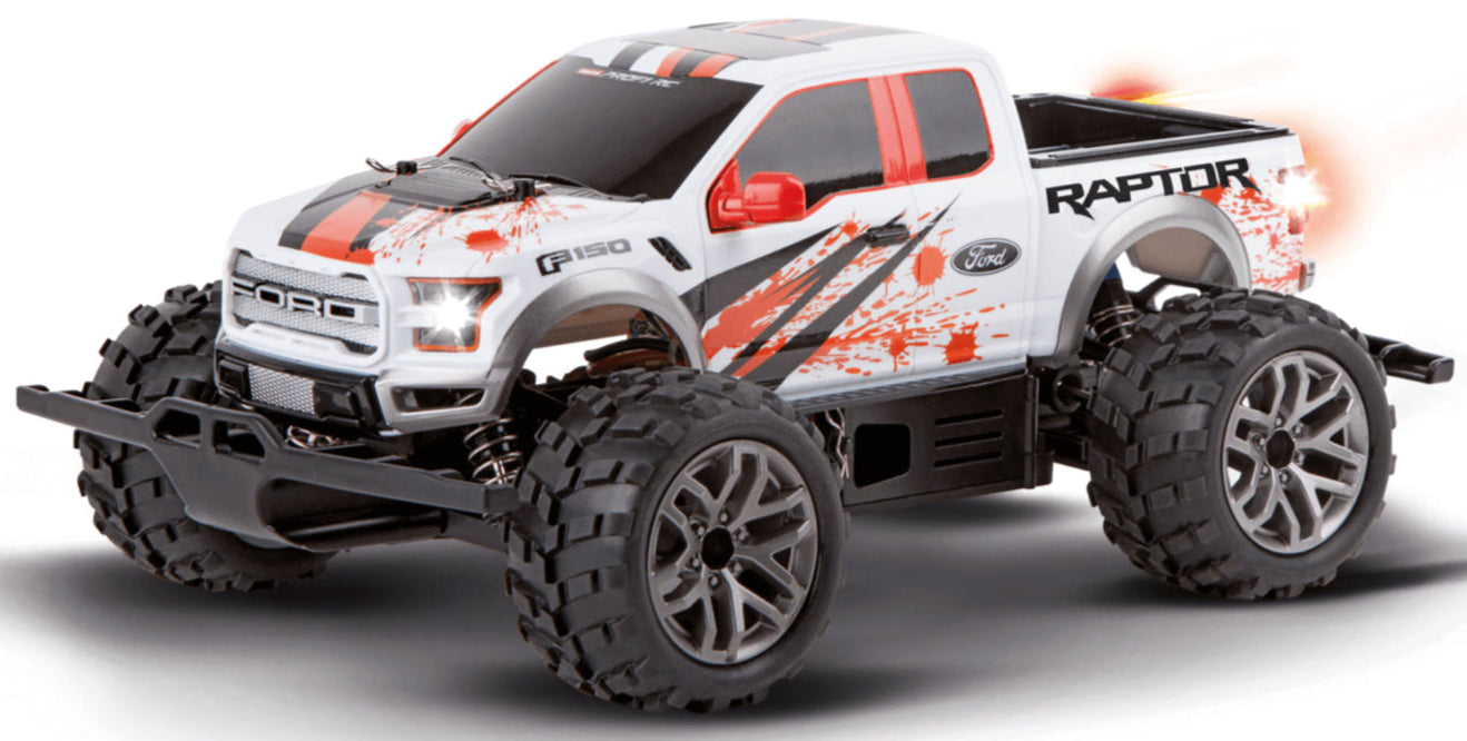 This car is a true professional. The Carrera RC Ford F-150 Raptor with its exclusively licensed Ford design is not only a real winner across the board in terms of looks. Under the hood of this approximately 27.5 cm long car, drivers will find – in addition to 2.4 GHz technology, headlights, rear and brake lights – many other technical features alongside Digital Proportional Control. Due to its all-wheel drive and oil pressure shock absorber, even rough terrain is no problem for this power pack! With a top speed of just over 30 mph, the Carrera RC Ford F-150 Raptor simply roars away from everyone else! No doubt: This car is not for the faint hearted!