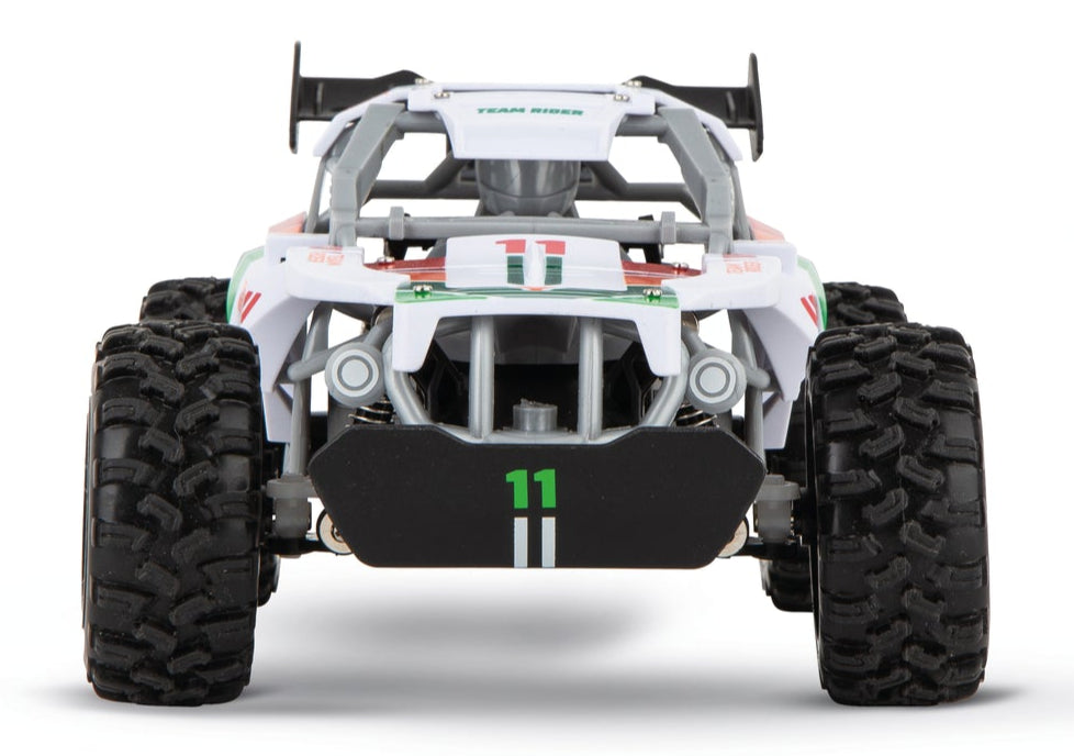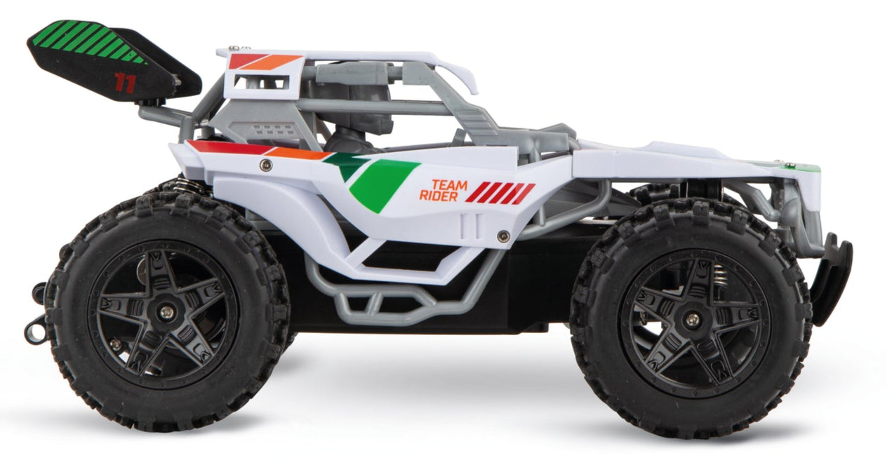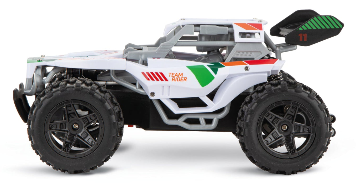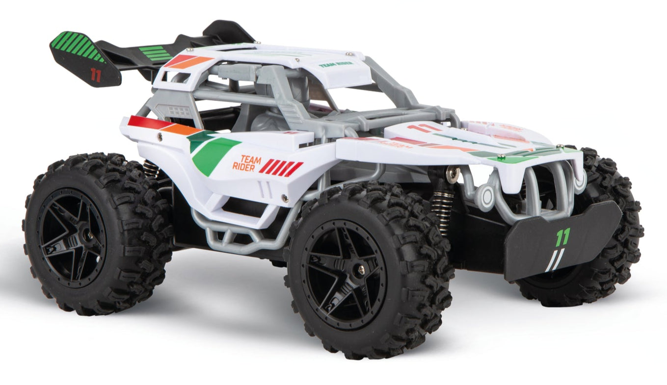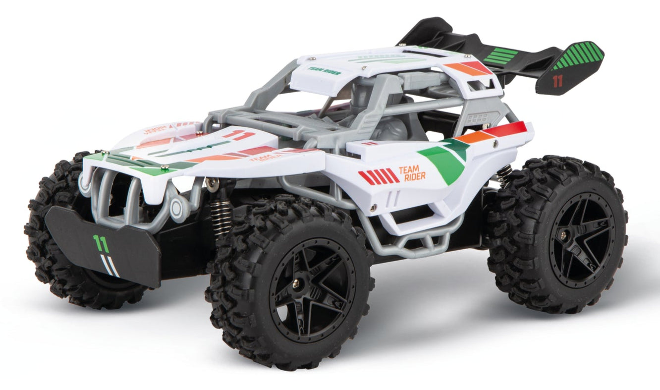 This buggy turns heads wherever it’s in action: the Carrera RC Lime Buggy’s striking lime green and yellow colour scheme always catches the eye; even more so with pneumatic tyres and all-round suspension, making it ideal for exploring rough terrain.