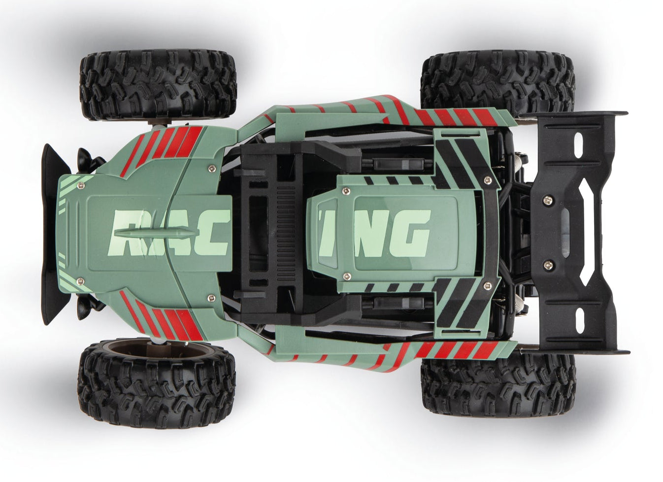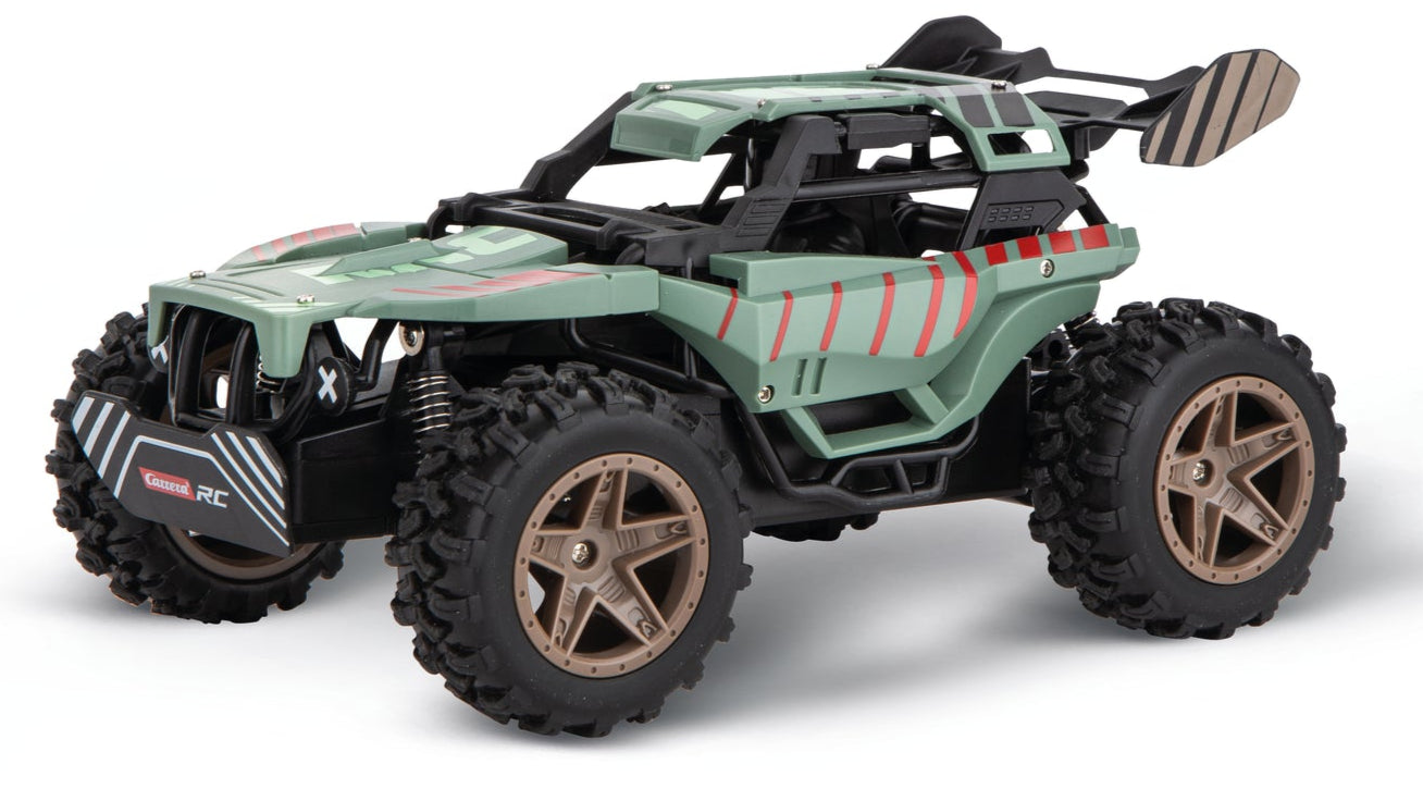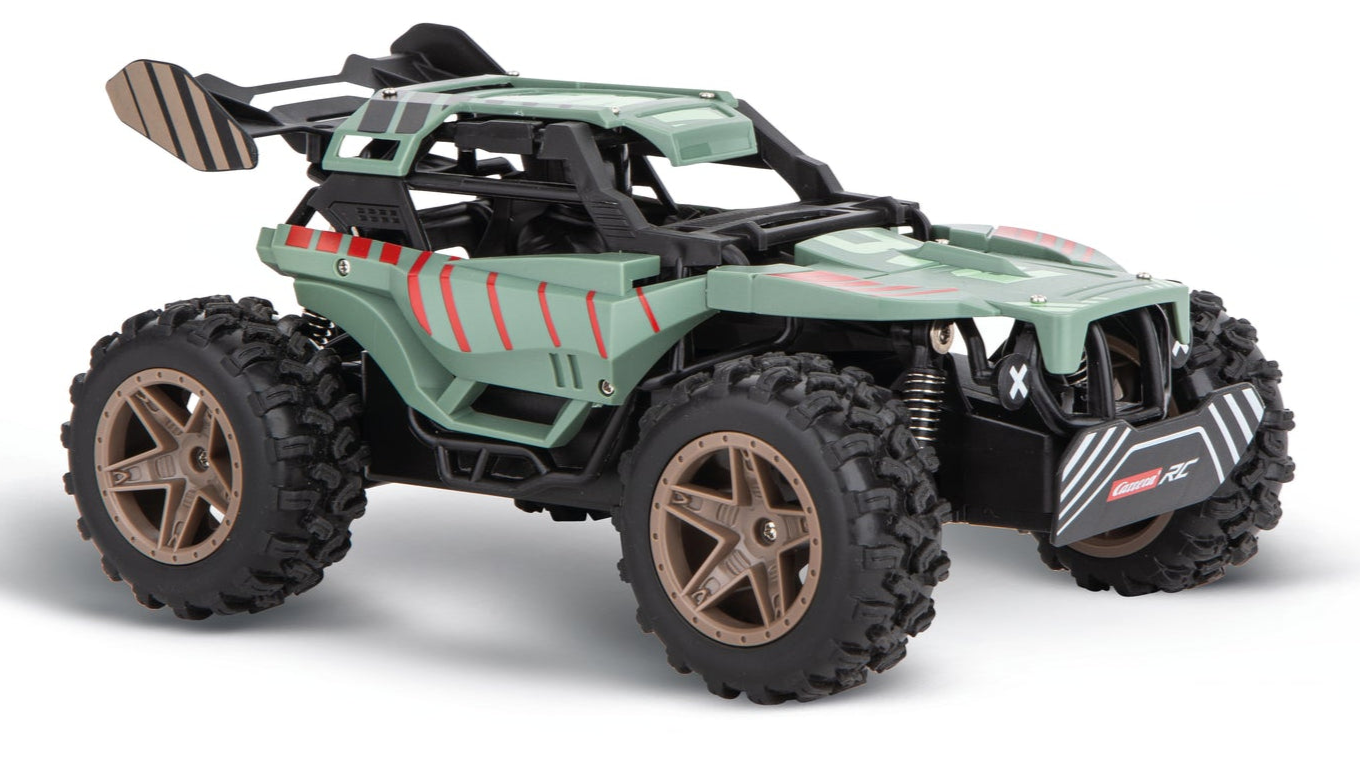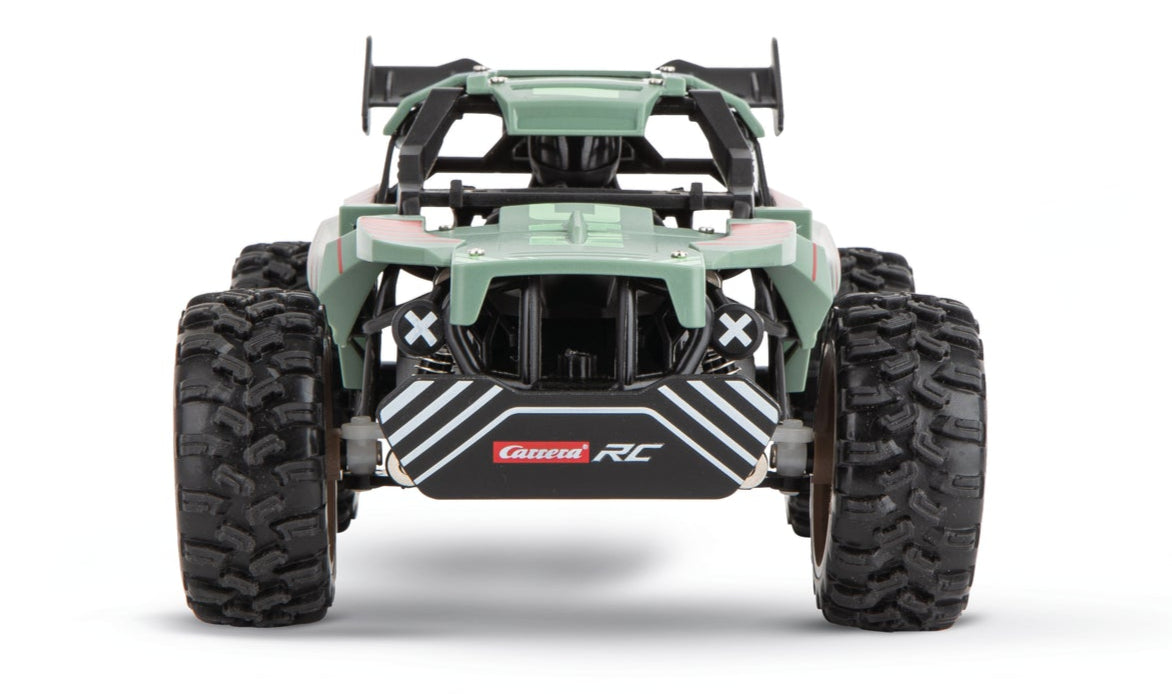This buggy attracts glares and stares wherever it's in action: The striking lime-green and yellow livery of the Carrera RC Lime Buggy never fails to catch the eye; even more so with pneumatic tyres and all-round suspension, making it ideal for exploratory trips out into rough terrain.