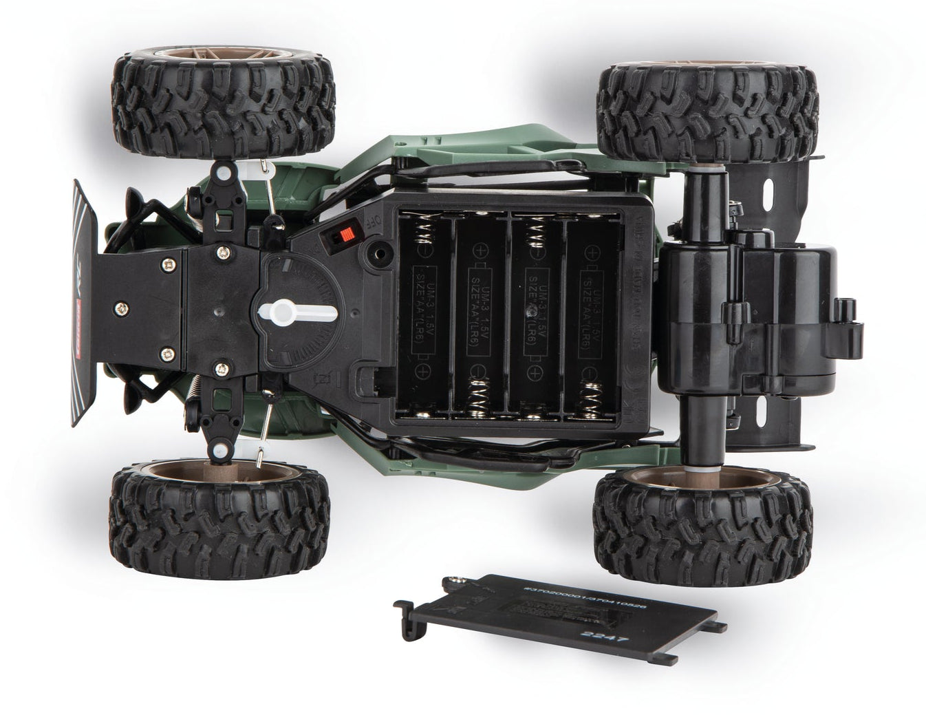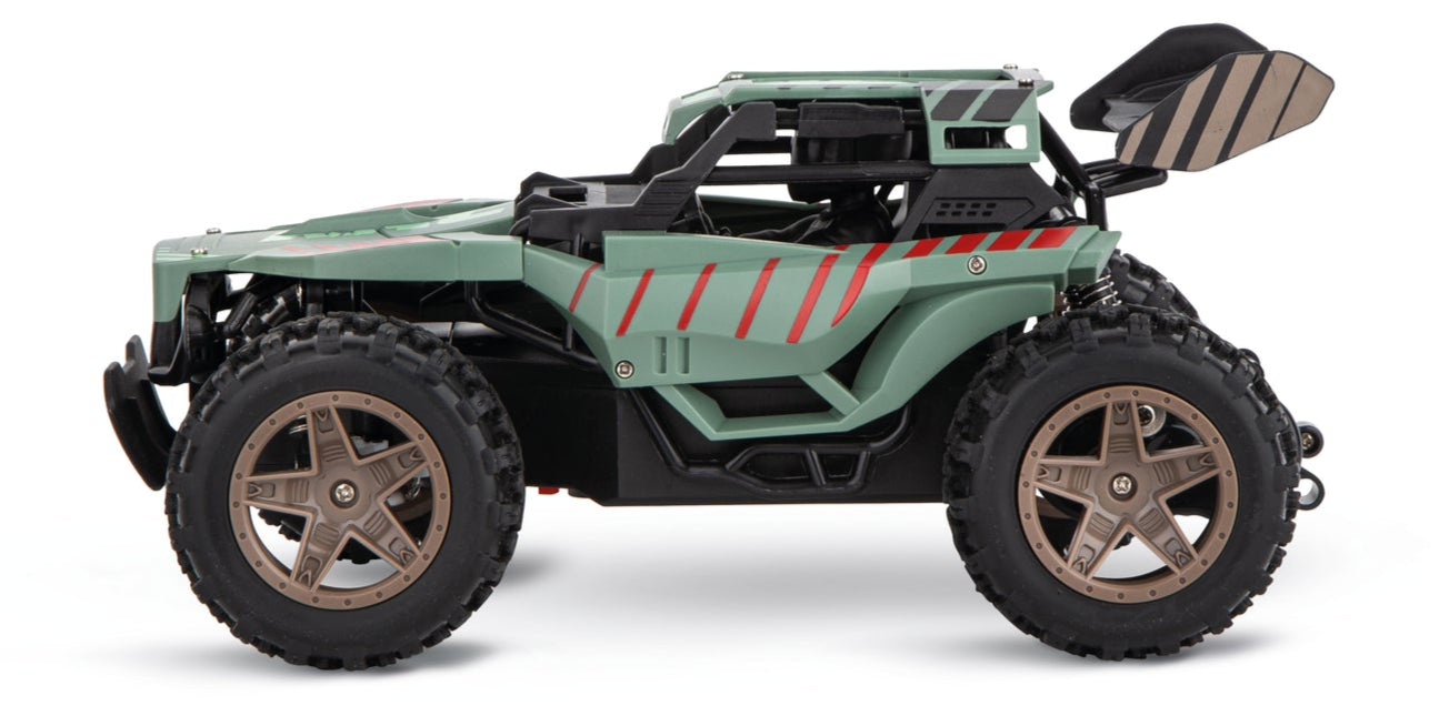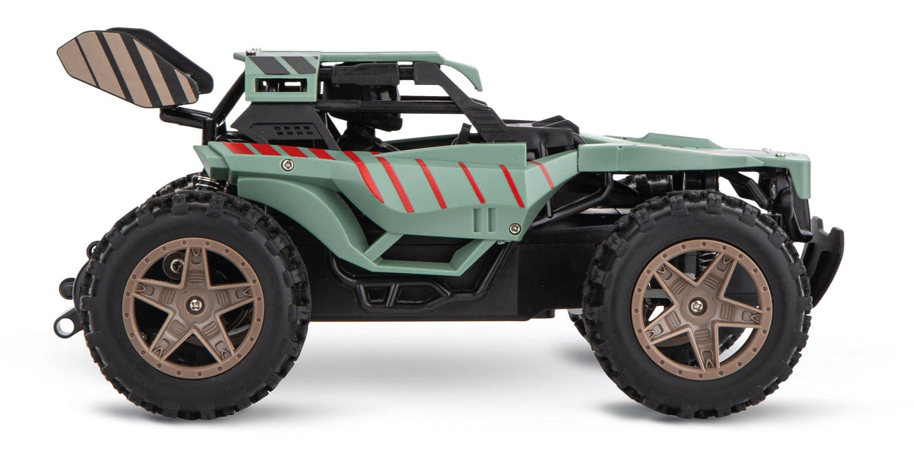 This buggy attracts glares and stares wherever it's in action: The striking lime-green and yellow livery of the Carrera RC Lime Buggy never fails to catch the eye; even more so with pneumatic tyres and all-round suspension, making it ideal for exploratory trips out into rough terrain.