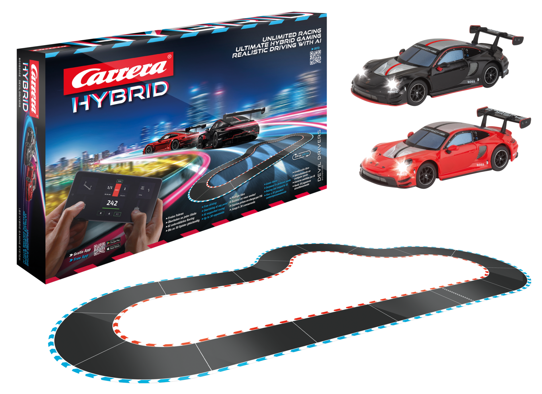 Carrera Hybrid – the perfect combination of gaming and racing fun, because the vehicles can race completely freely over the road at full throttle. AI support allows for a realistic driving experience in different driving modes. Experience true-to-the-original vehicles with front and rear lights, controlled via a free app. With automatic track detection, individual settings and authentic engine sound, Carrera Hybrid offers a unique racing experience. Plus, discover new vehicles for even more racing action!