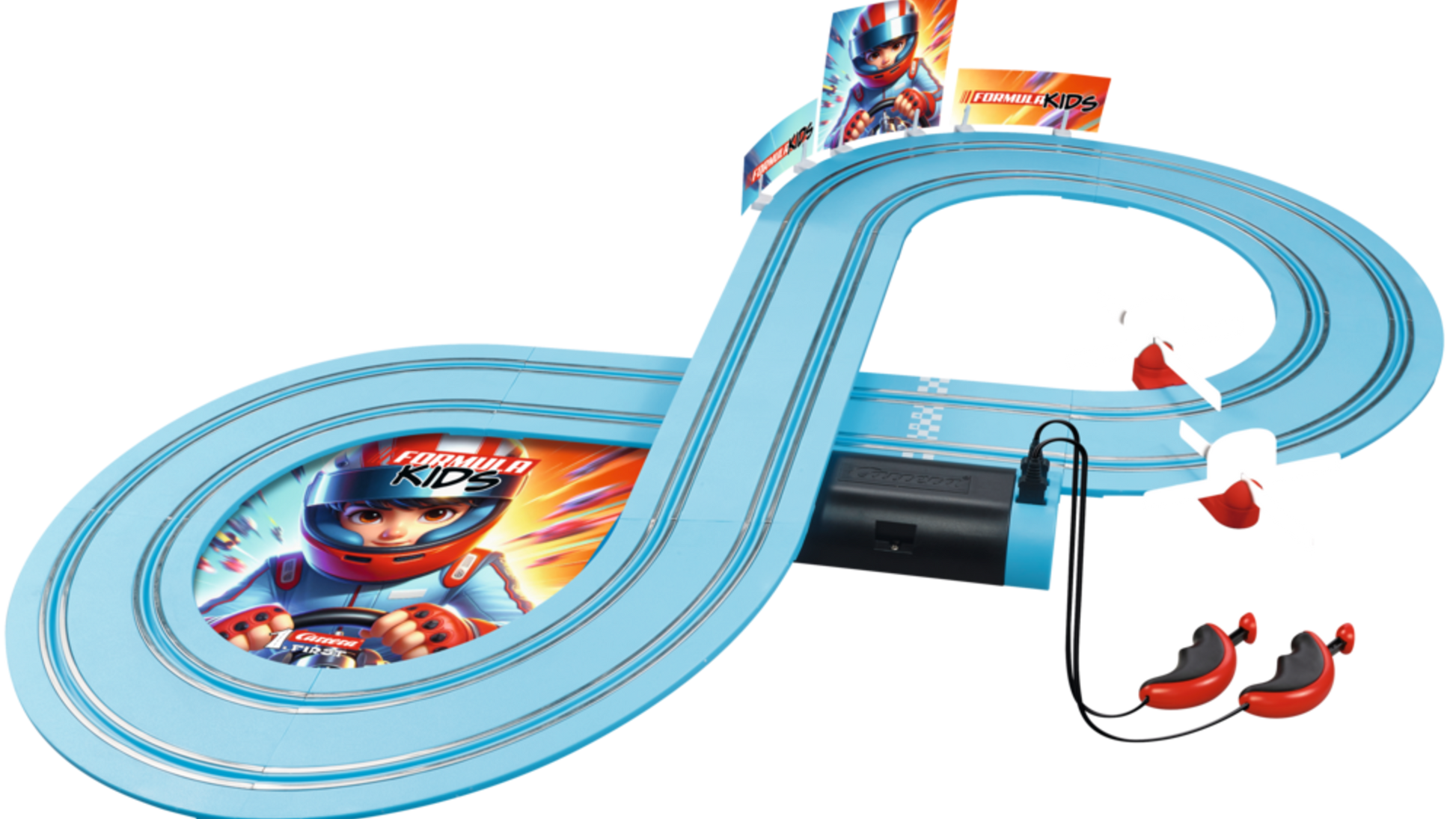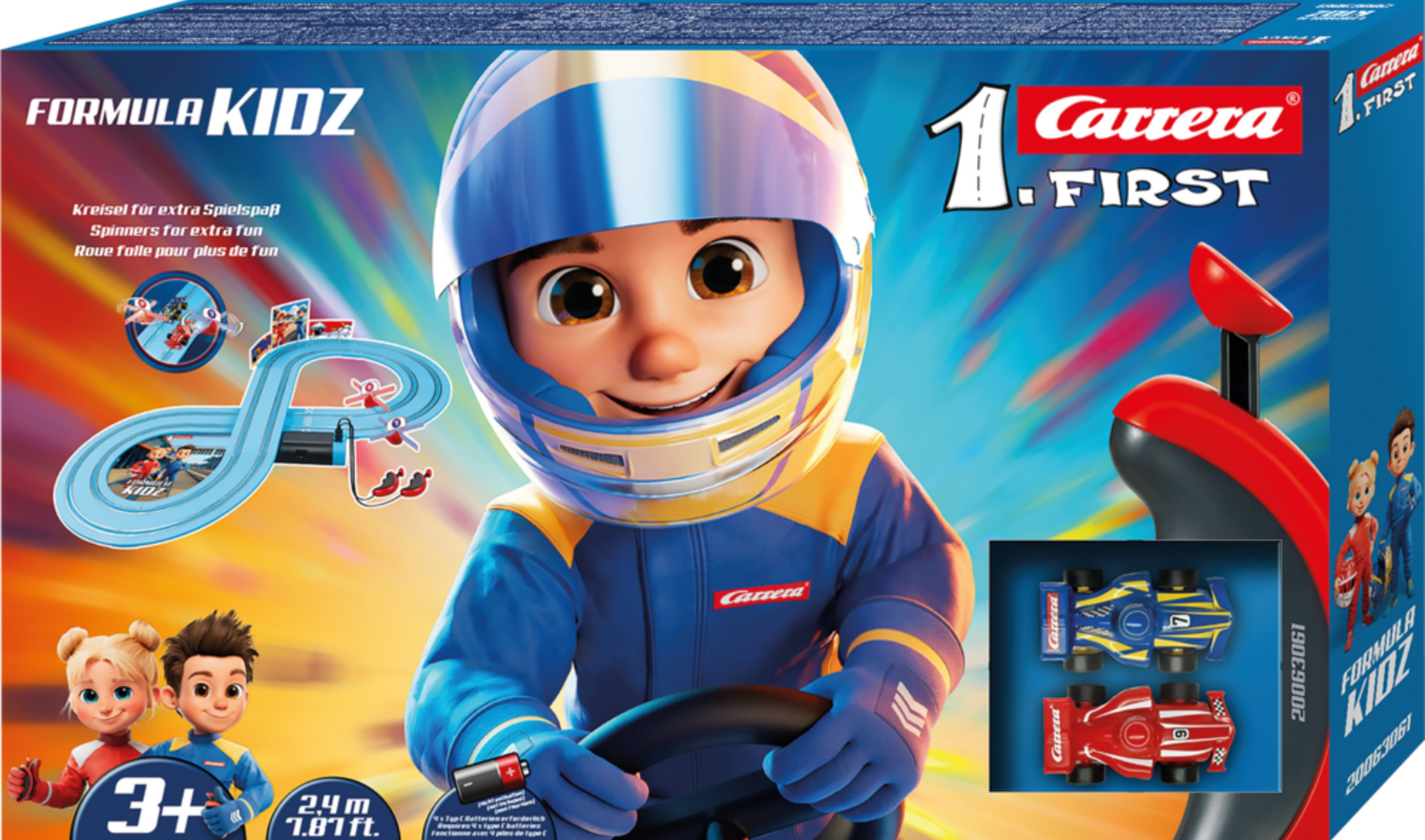 The Carrera First: Formula Kidz Set brings racing fun to the playroom with a 1:50 track, blue rails, and colorful decorations. The electronic controllers are designed for small hands, and a built-in sp inner adds extra excitement. With the cars Formula Kids Racer Blue and Formula Kids Racer Red, young drivers can enjoy their first thrilling head-to-head duels.
