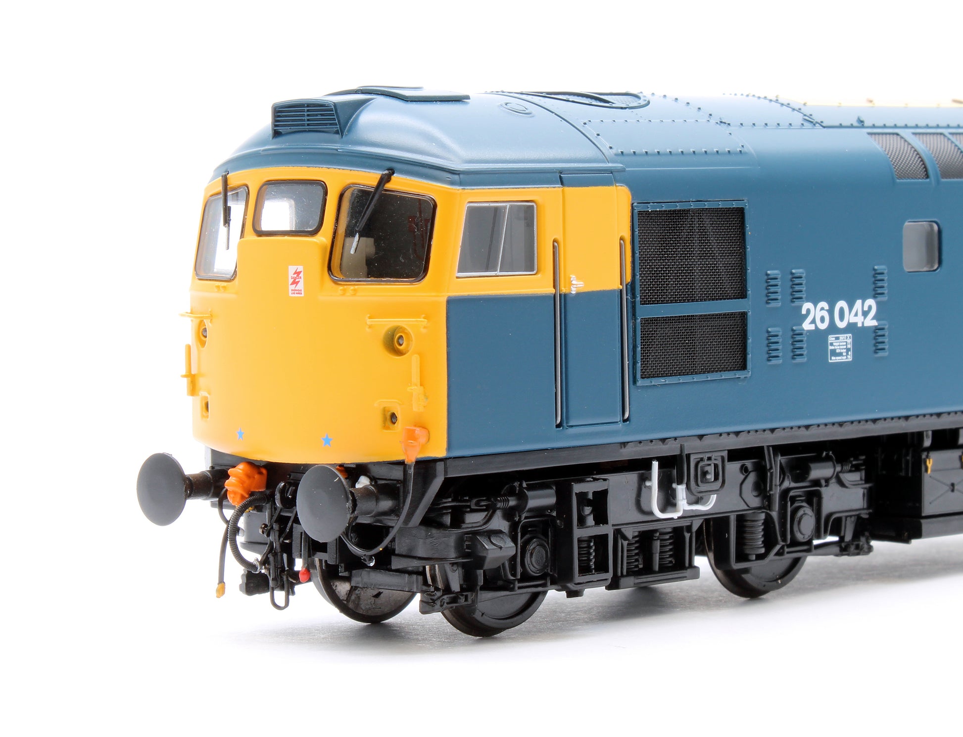 - Several body options: As built Class 26/1 with tablet catcher & recess, unrefurbished locos with tablet catcher recess plated over and refurbished dual-braked locos with air tank cradle between bogies