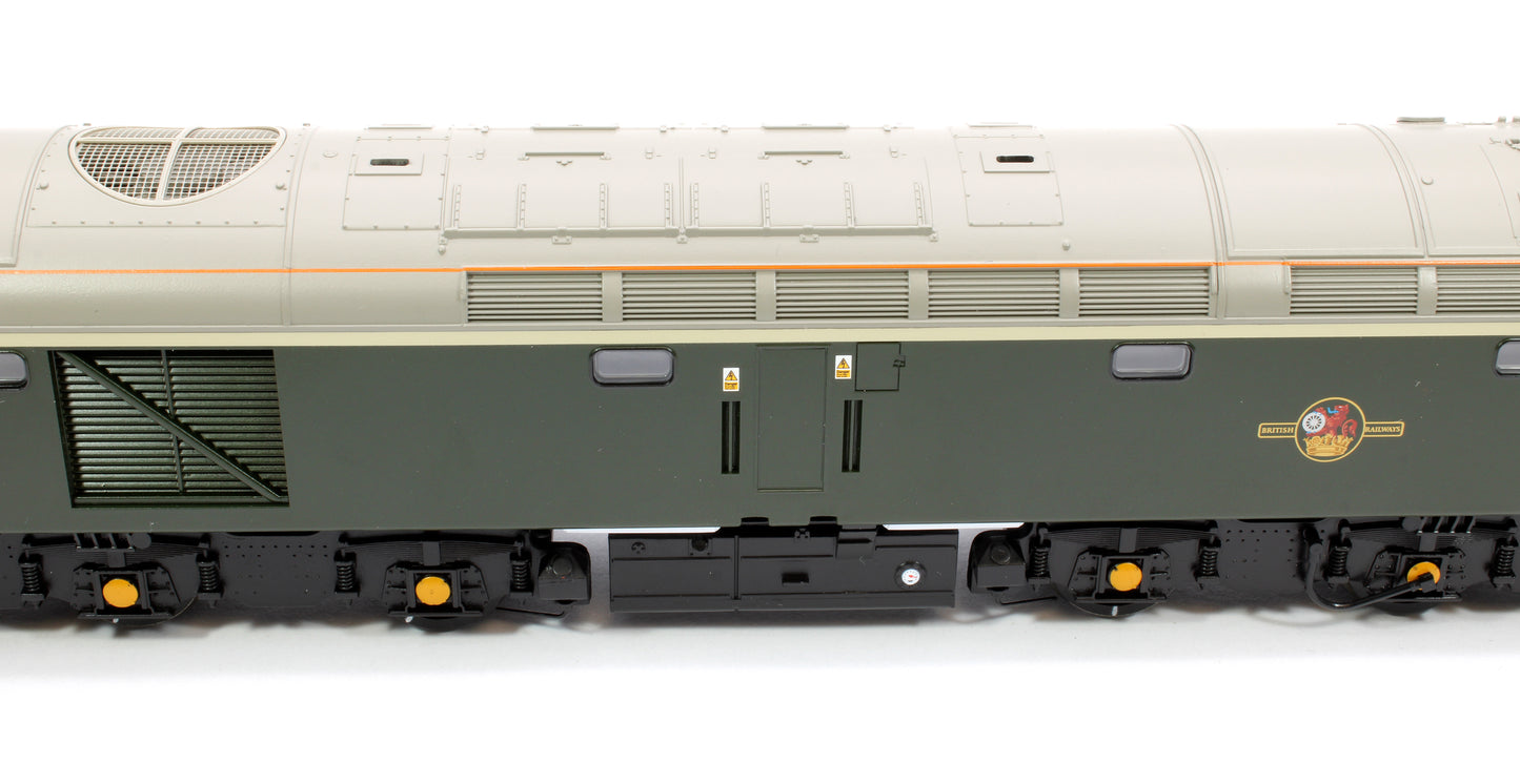 The Class 40 Diesel Locomotive has long been a highlight of the Bachmann Branchline OO scale fleet, and for 2023 this popular model has been upgraded to bring you more features than ever before. This model depicts preserved locomotive No. D345 which is presented in its current condition, carrying retro BR Green livery with small yellow panels but with the modern adornments of overhead warning flashes and orange cantrail lining. The locomotive’s unique nose end combination, with central headcode panels and high intensity headlights, is also modelled faithfully on this SOUND FITTED model.