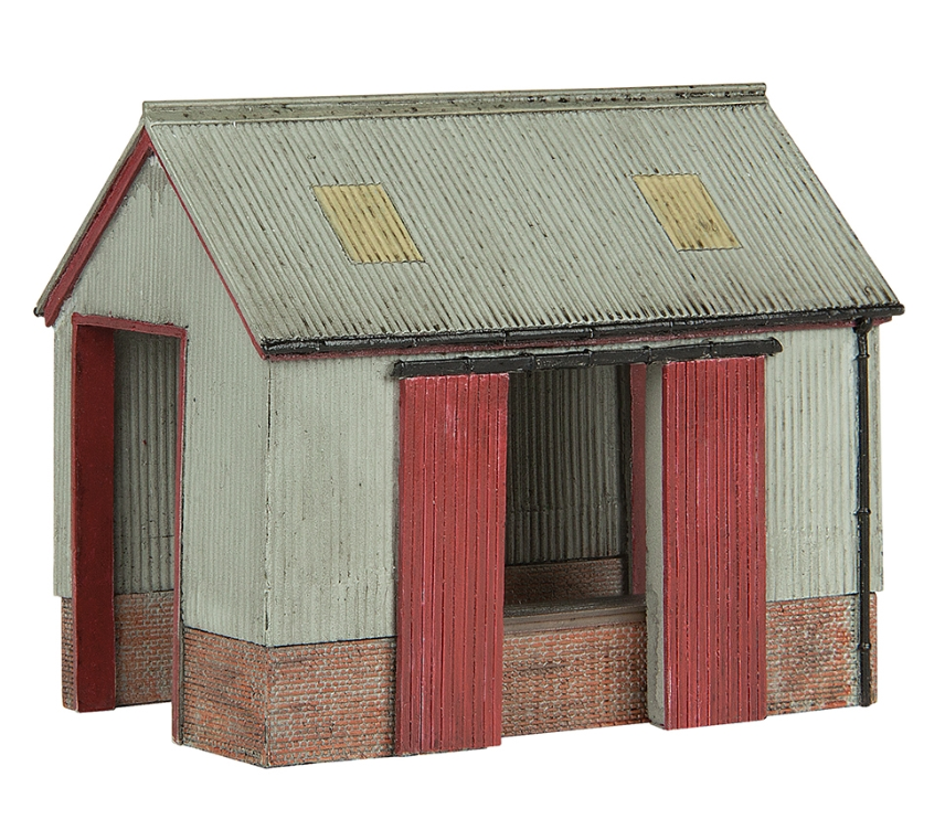 Sheds like this one were commonplace at many stations and rail yards across the country, where they were used to store and transfer goods. With a brick base and corrugated metal roof, this model can be convincingly placed to add depth to any layout where goods would be handled.