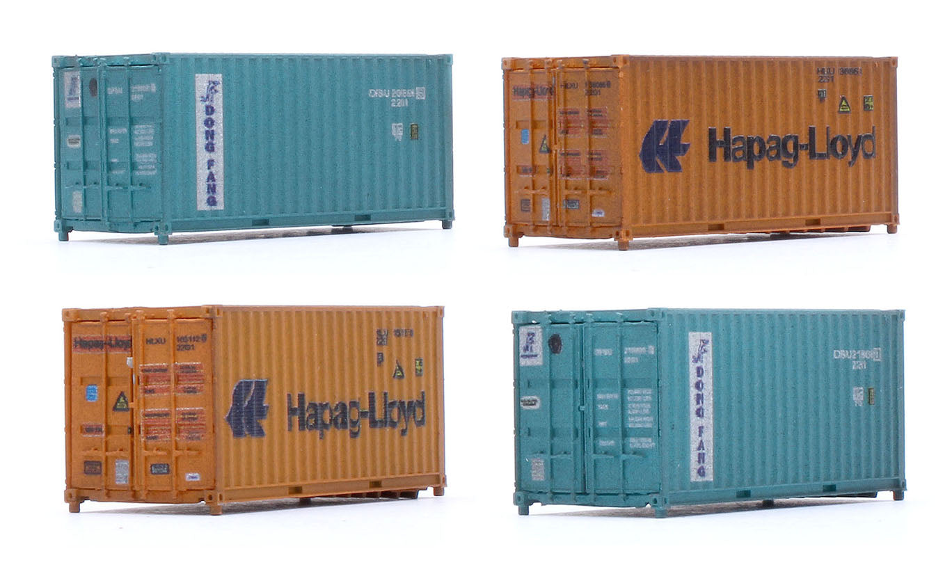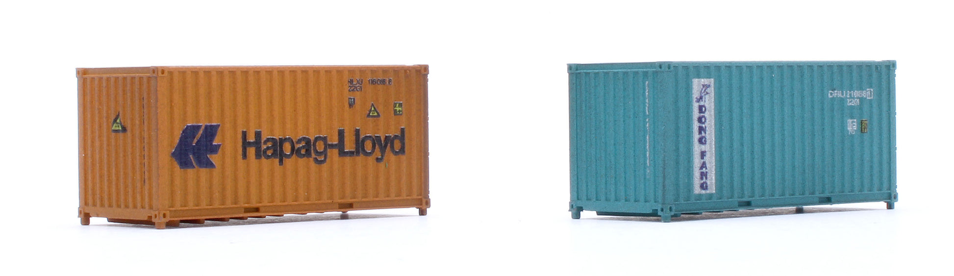 Set of two 1:148 Scale 20ft Containers decorated in Hapag-Lloyd/Dong Fang livery. This model features lots of expertly applied details as based on the prototype and a high level of body detail.