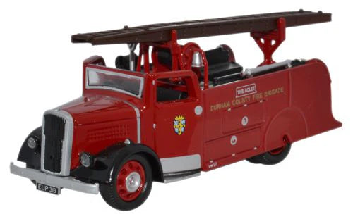 This Dennis Light 4 appliance, registered EUP 313, depicts an example featuring the livery of Durham County Fire Brigade with whom it operated in the post war years. The engine named 'The Aclet' originated in 1941 when it was delivered to Bishop Auckland Fire Brigade passing to Durham County Fire Brigade in 1948. It served with that brigade until 1972, ending its days as a training school appliance.