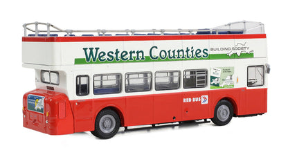 Our model depicts registration 925GTA (formerly ‘Admiral Blake’) in its post-1983 condition after transfer from Western National to North Devon Limited, a National Bus Company operator trading as Red Bus. The model is finished in NBC poppy red and white livery with Red Bus branding and full Western Counties Building Society advertising all round. The lower position route blind carries a service 301 to Westward Ho! Destination, while the later style of replacement rear engine bustle completes the model.