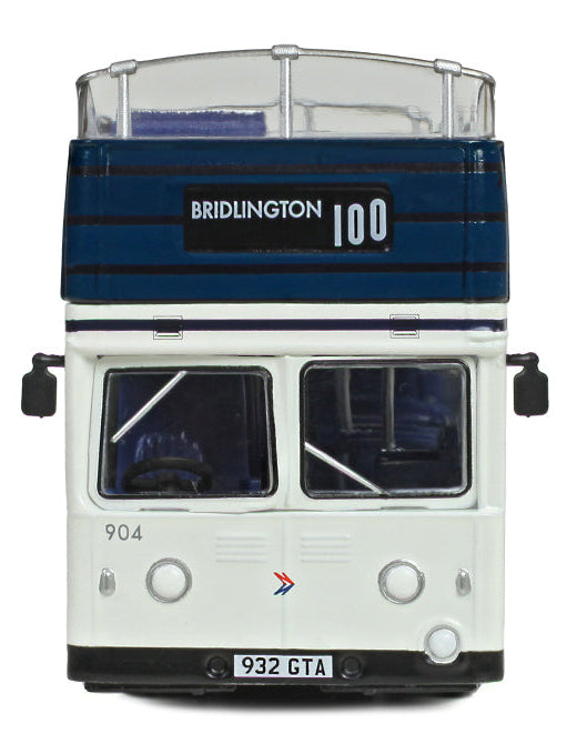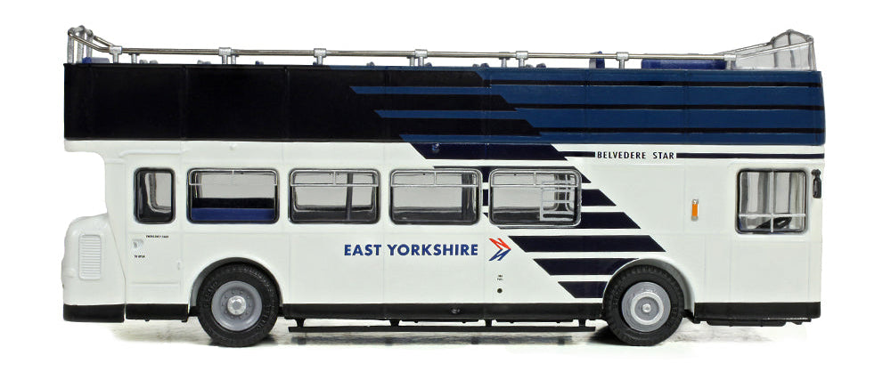 Our model depicts registration 932GTA (originally ‘Earl Howe’) in its circa 1984 condition as working for East Yorkshire NBC in the Bridlington area. It is finished in NBC’s striking white and blue ‘venetian blind’ livery, complete with East Yorkshire branding, fleet number 904 and the name ‘Belvedere Star’. The front blind carries a service 100 to Bridlington destination.