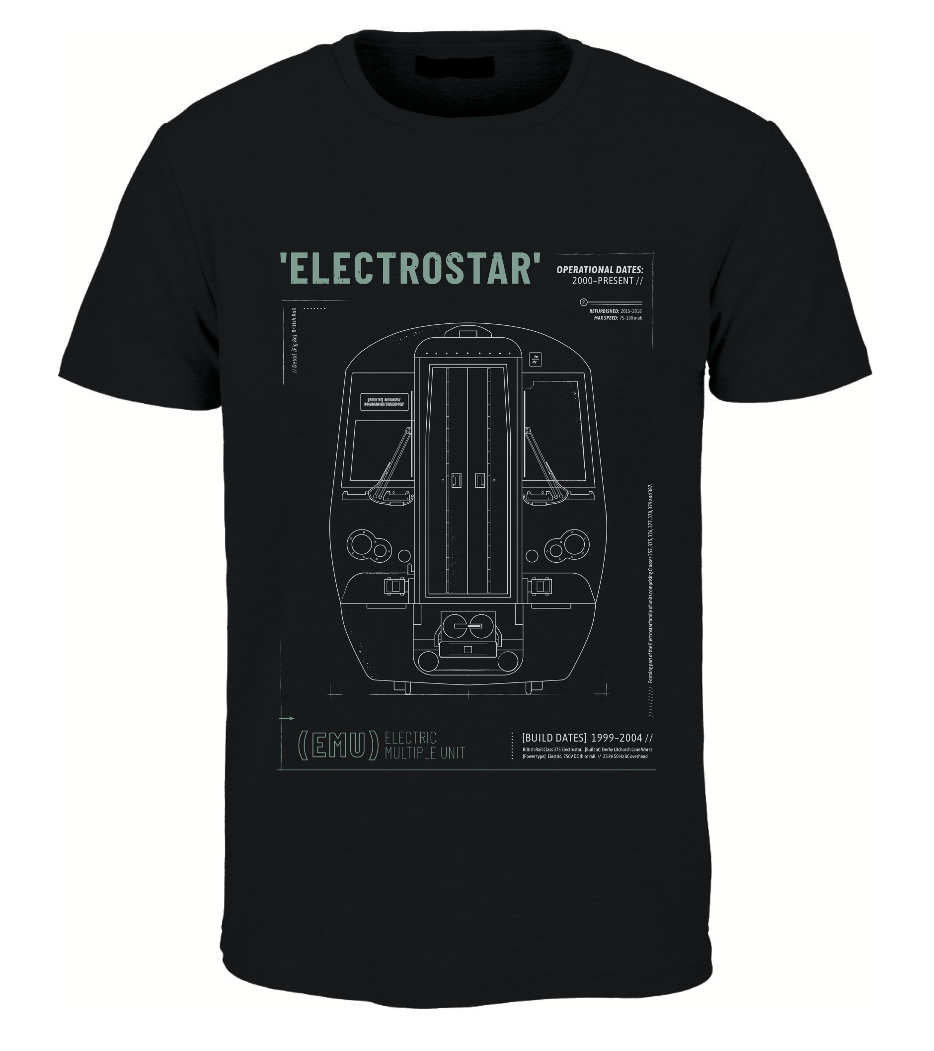 Just Threads ELECTROSTAR-TEE-BK Electrostar EMU Technical Drawing Blueprint Railway T Shirt (Black)