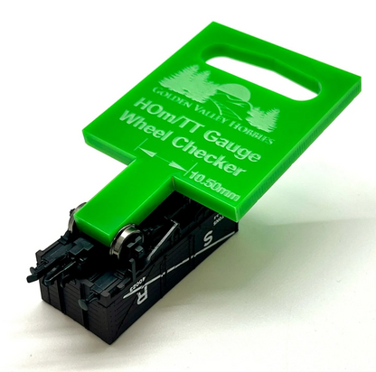 Our gauge is set to 10.50mm - the correct width for standard TT or HOm gauge track. It's ideal for Hornby, Peco, Tillig, etc items. The gauge should be a friction fit - if not adjust the wheels on the axles or replace if necessary.