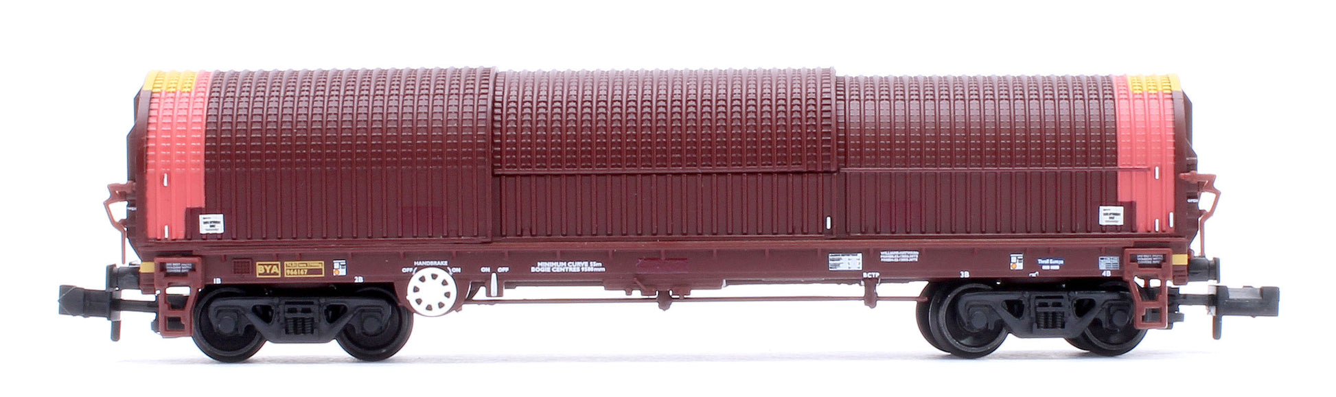 The steel industry has long depended on rail to transport its products around the UK and in the late 1990s EWS had a number of new wagons built by Thrall in York to carry steel rod coil. Assigned the TOPS code BYA, the wagons feature a strong underframe with four loading racks, and a three-piece telescopic hood was fitted to protect the load from the elements.