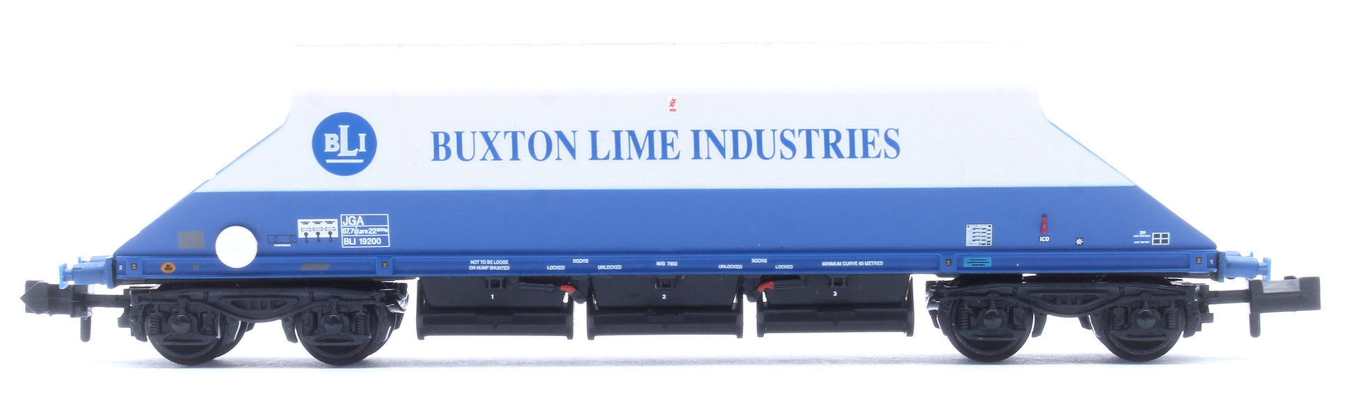 The JGA Bogie Hoppers were built in Slovakia in the mid-1990s for Buxton Lime Industries and Tilcon, primarily working from Tunstead Quarry, operated by Buxton Lime Industries, near Buxton on the edge of the Peak District. Consisting of a large hopper with three pairs of bottom discharge doors, the wagons were used to transport lime products from the quarry for distribution around the UK.