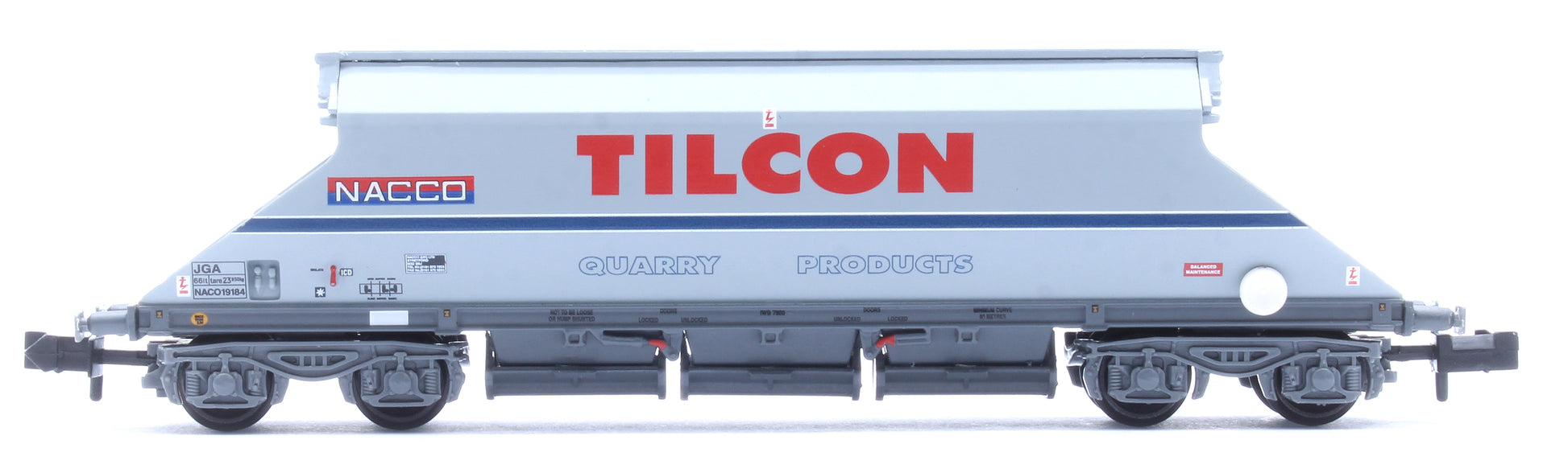 Reproduced in N Scale by Graham Farish, the JGA model features a precision moulded bodyshell which captures the wagon’s distinctive sloping ends with their ribbed constructed. The hopper covers that adorned the wagons built for Tilcon are a separate addition, as are the three sets of discharge doors fitted to the underframe, meanwhile a metal weight is concealed above each bogie to ensure smooth running. The bogies themselves are fitted with metal wheels and axles whilst the integrated NEM coupling pockets allow alternative couplings to be fitted with ease. The grey livery is enhanced with red and blue stripes and the large red Tilcon lettering, along with the colourful logo of NACCO – the wagon leasing company, all reproduced in full detail along with the various markings and operating instructions that are found on the real wagons.
