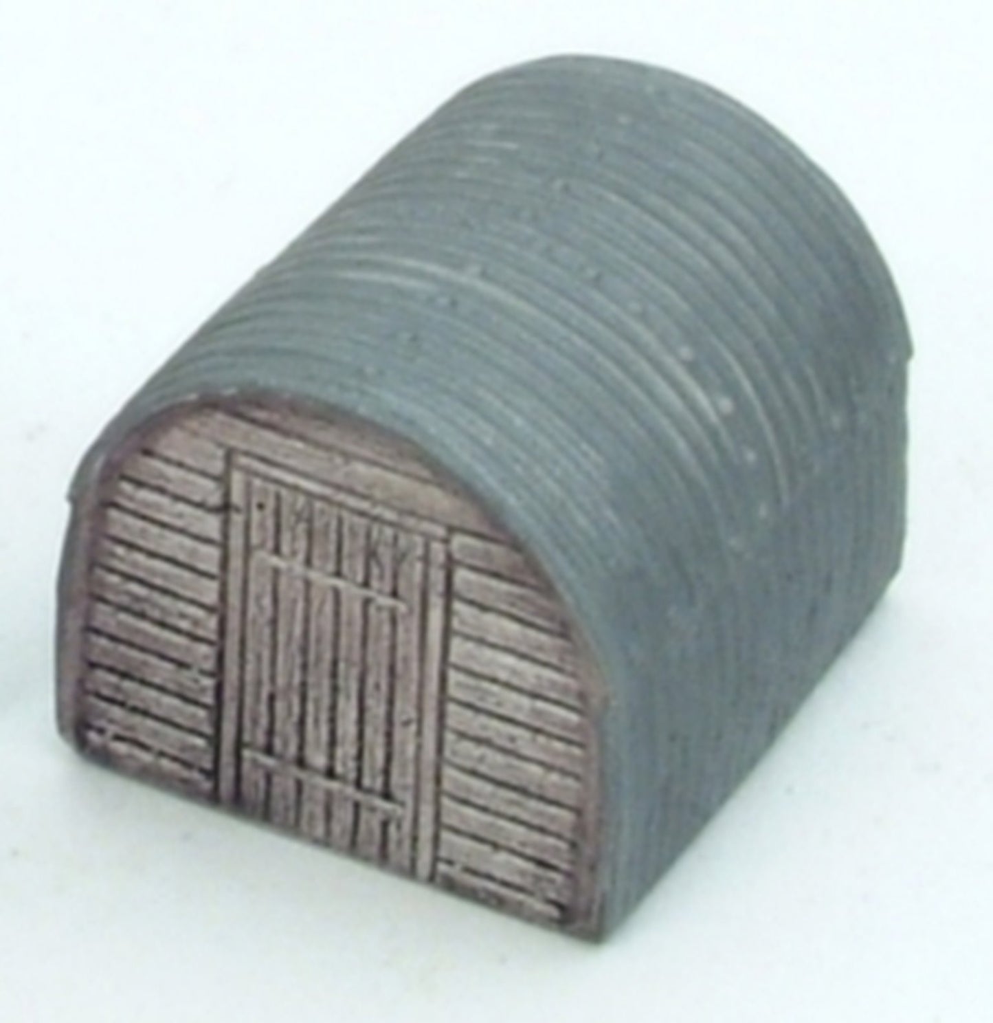 Mass produced corrugated iron shelter with wooden planked ends. Size approx (mm) L35 x W30 x H28. The Harburn Hamlet range of painted resin accessories provide interesting scenic details for your layout.