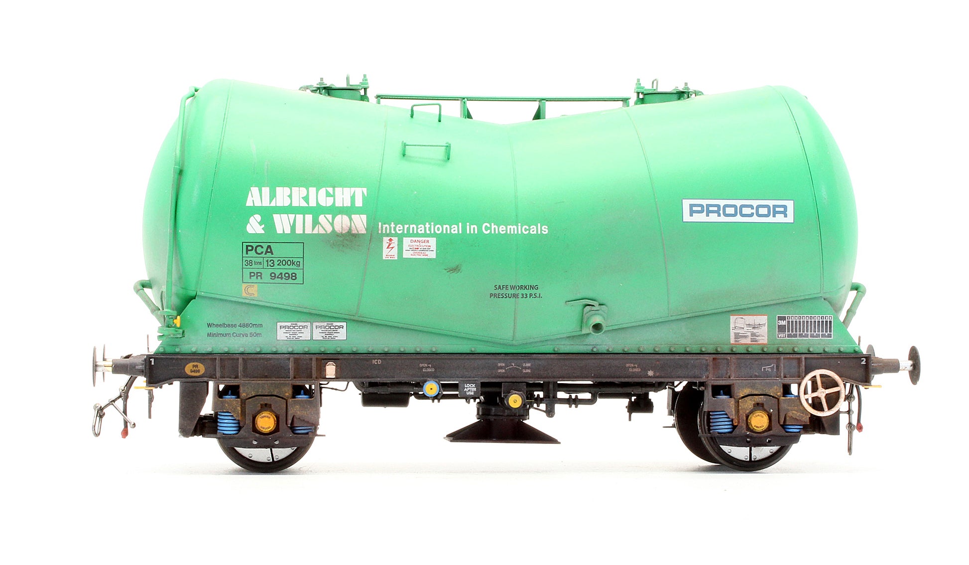 Heljan 1091 Pre-Owned PCA Tank Wagon PR 9498 Albright & Wilson Green (Procor) - Custom Weathered