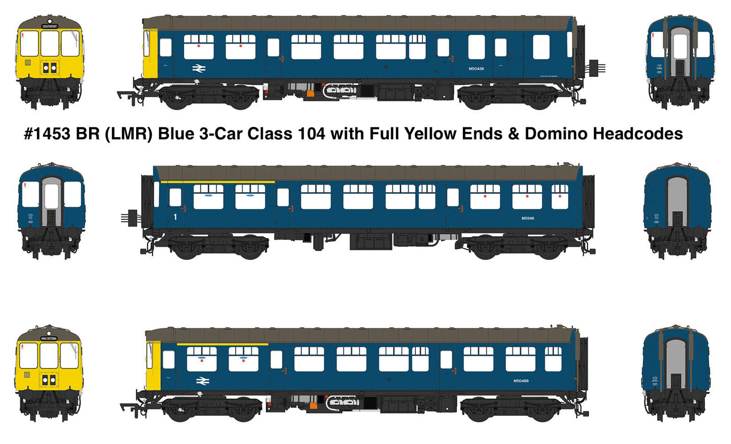 Heljan 1453 Class 104 3 Car DMU M50436/M59141/M50488 BR Blue (Full Yellow Ends / Headcode Panel)