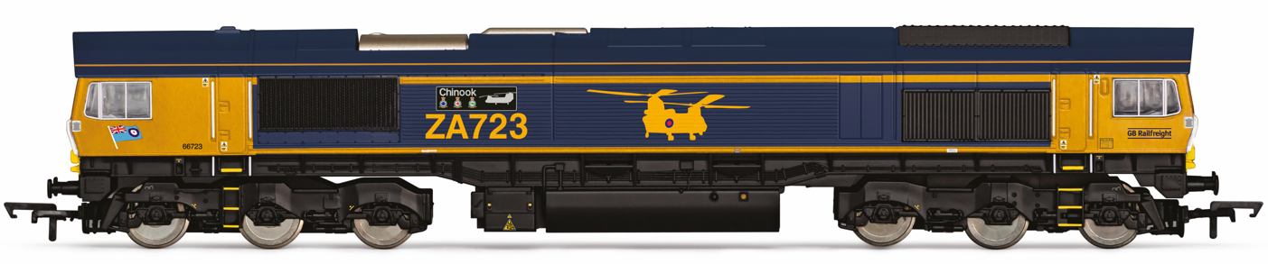 This RailRoad Class 66 diesel was built for freight trains and operates across the UK making it the perfect locomotive for your model freight train. It is compatible with many wagons from Hornby. It comes DCC-ready with a 21-pin plug, meaning it can be upgraded to run on DCC or with our HM7000 Bluetooth-controlled system, which also includes sound via a speaker inside the locomotive.The Class 66 is a heavy-freight diesel-electric locomotive, a development of the earlier Class 59 which was a great success in the UK with Foster Yeoman. Like its predecessor, EMD Co-Cos have all been built in North America, with 480 supplied to UK operators between 1998 and 2008 and 2014 and 2015. Many more were bought secondhand from mainland European operators, so it is no surprise that these machines handle the lion’s share of freight traffic in the UK today. Despite being called ‘sheds’ by enthusiasts because of their shape, they have carried many colourful and innovative liveries.No. 66723 ‘Chinook’ is in GBRf blue and orange livery, and is named in honour of the RAF’s 7, 18 and 27 Squadrons based at Odiham in Hampshire. This is also the home of the CH-47 Chinook heavy lift helicopter, one of which adorns each side of the locomotive’s body.