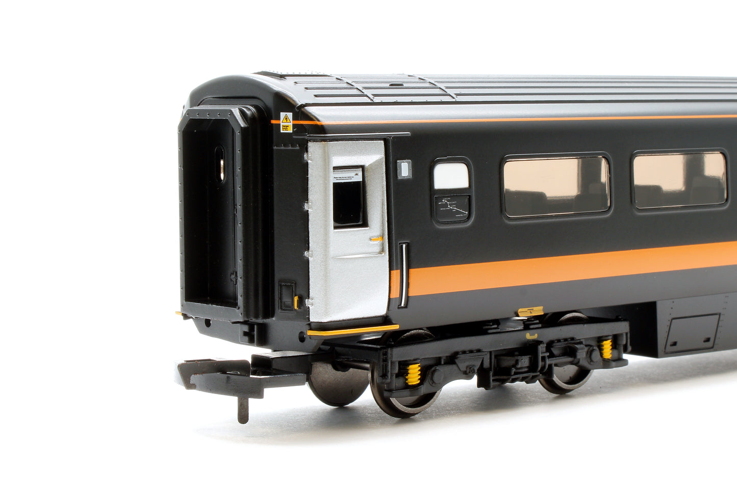 The Mk3 TSO coach model sports the distinctive Grand Central black and orange striped livery with the iconic Grand Central logo emblazoned in the middle of the stripe. Featuring an accurate corridor connection and close coupling, this model is suitable to run with a Class 43 power and dummy car from the R30375 Grand Central HST Pack.