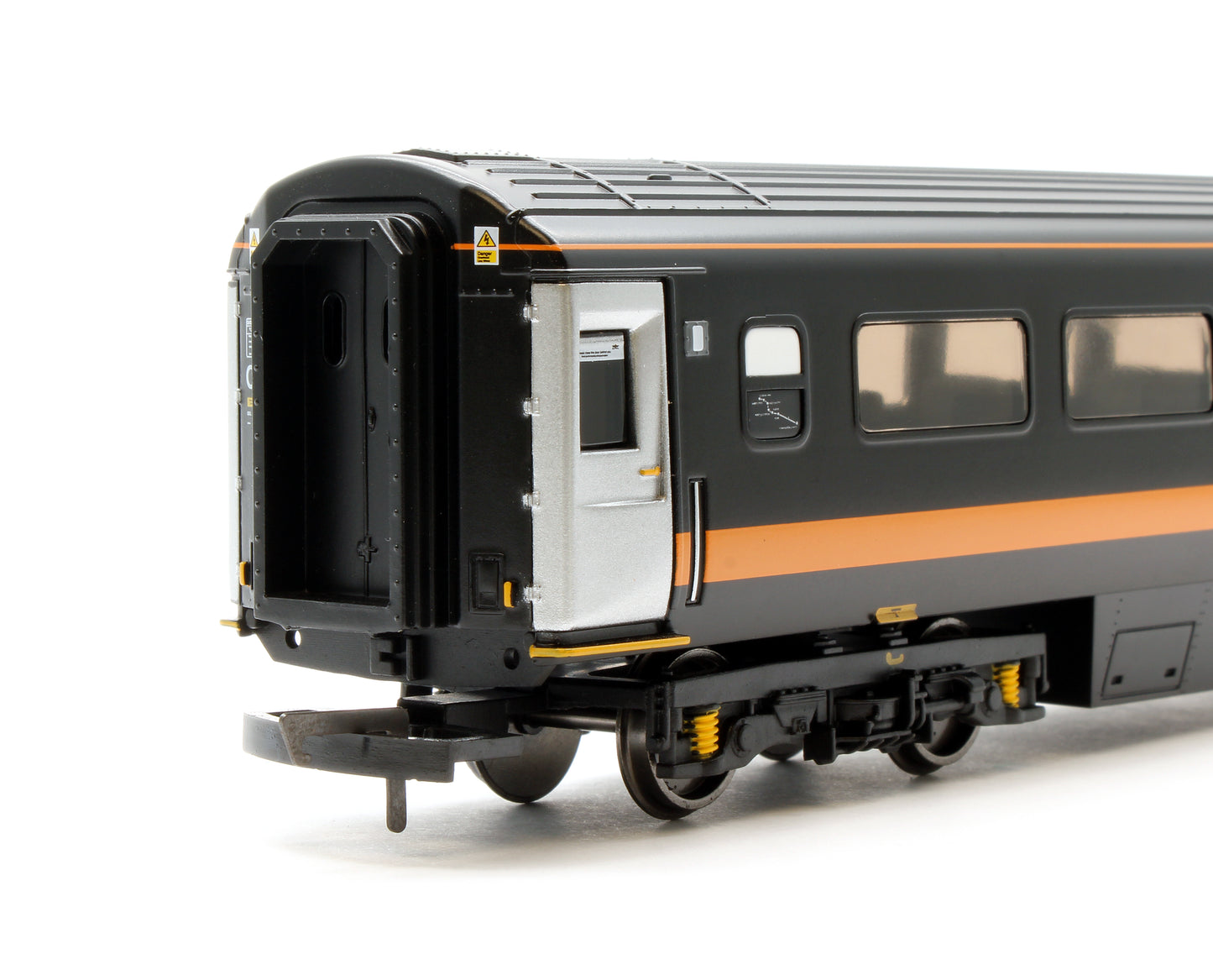 The Mk3 TSO coach model sports the distinctive Grand Central black and orange striped livery with the iconic Grand Central logo emblazoned in the middle of the stripe. Featuring an accurate corridor connection and close coupling, this model is suitable to run with a Class 43 power and dummy car from the R30375 Grand Central HST Pack.