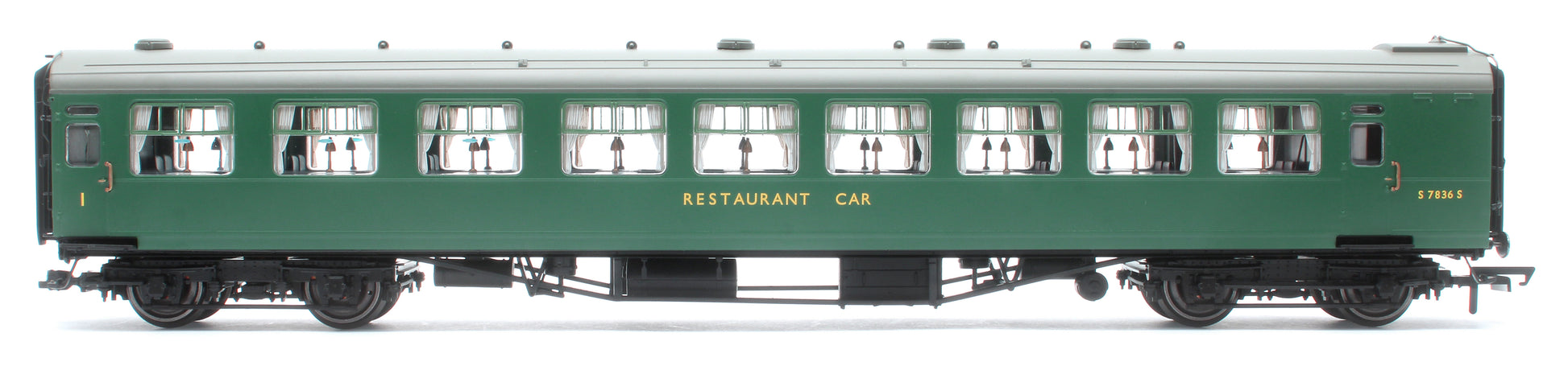 The dining cars were unpopular and were quickly re-fitted in 1950, at which point the mock brickwork on the ‘taverns’ was repainted in plain carmine. They lasted in service in their pairs until late 1959 but were repainted in unlined BR(SR) green in 1957. Similar pairs of ‘Tavern Cars’ operated on other BR regions.