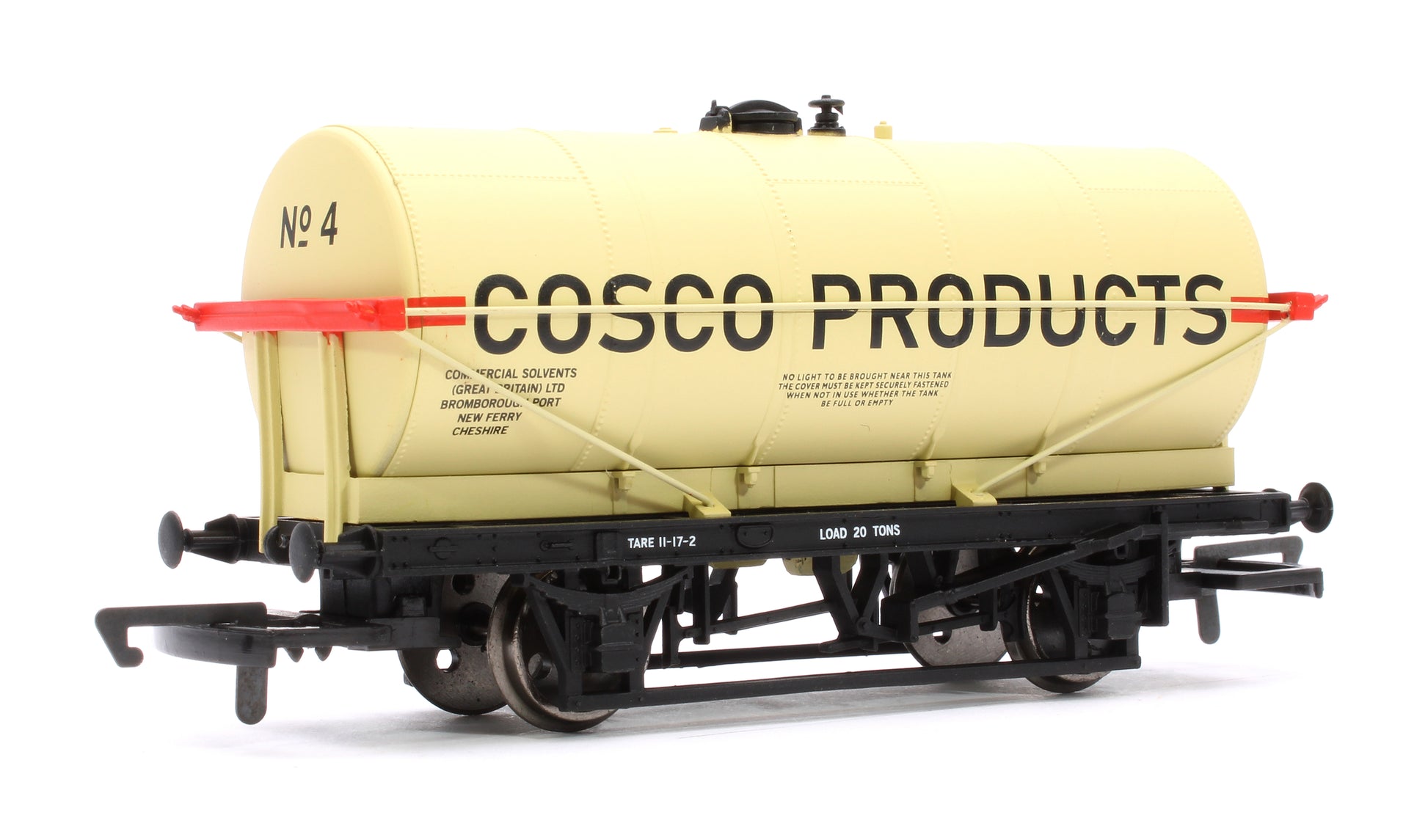 This 20T tank wagon features the livery of Cosco Products and would be based at Bromborough Port in Cheshire. This example is typical of the tank wagon traffic that would be found on British railways in the 20th century. Tank wagons were divided into class A and Class B with the less common Class A wagons being built to contain more volatile substances. Prototypically, this wagon would be found in the late 1930s.