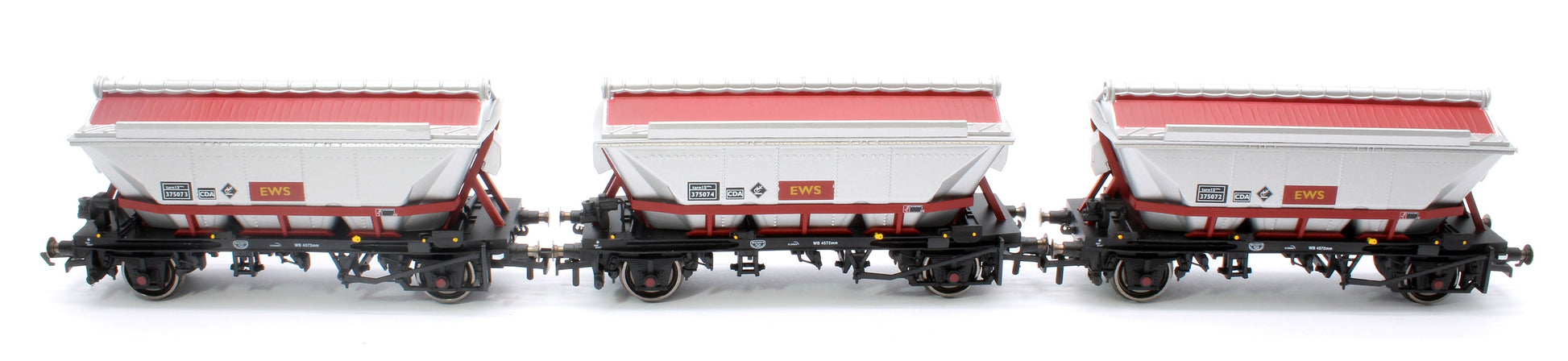 China clay, more formally known as Kaolinite, is one of the main products of the south west of England. Until the 1980s this cargo was transported by rail using small wooden wagons covered with tarpaulin. Based upon the HAA wagon design, CDA wagons featuring a flexible hopper covering to protect the clay from the rain were introduced in 1987 carrying the livery of English China Clays, although more recently they have been repainted in EWS colours. Wagons included in this pack: EWS CDA 375072; EWS CDA 375073; EWS CDA 375074.