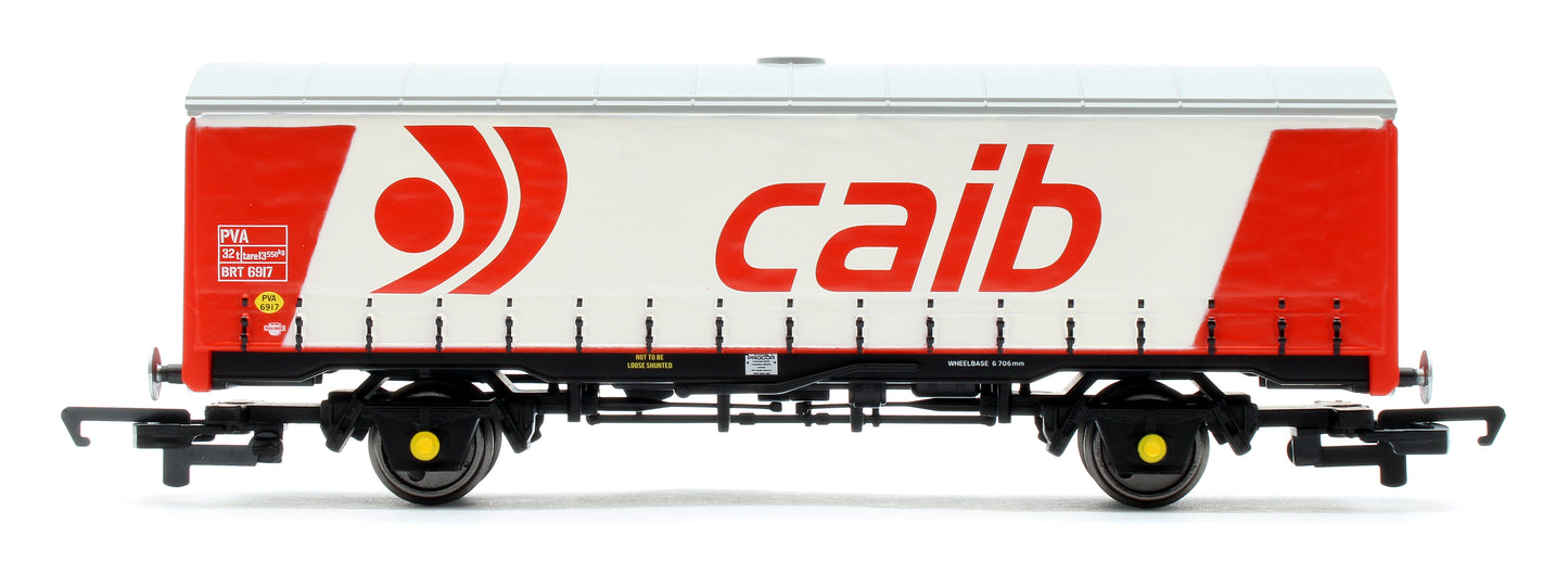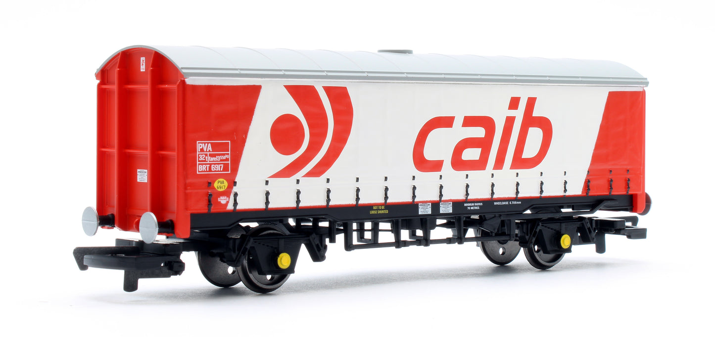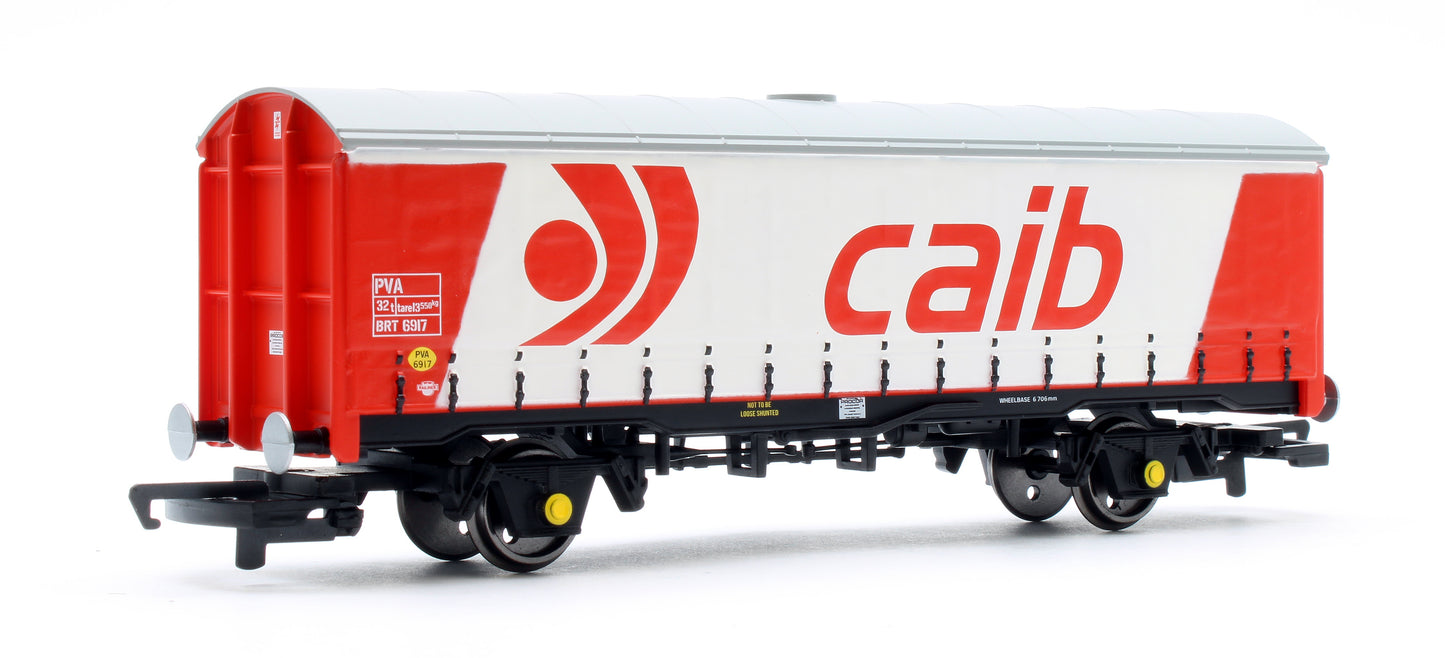 The model features a PVA curtain sided van with the side featuring a white CAIB livery. It incorporates fixed tension couplings for easier coupling to other locomotives and rolling stock.